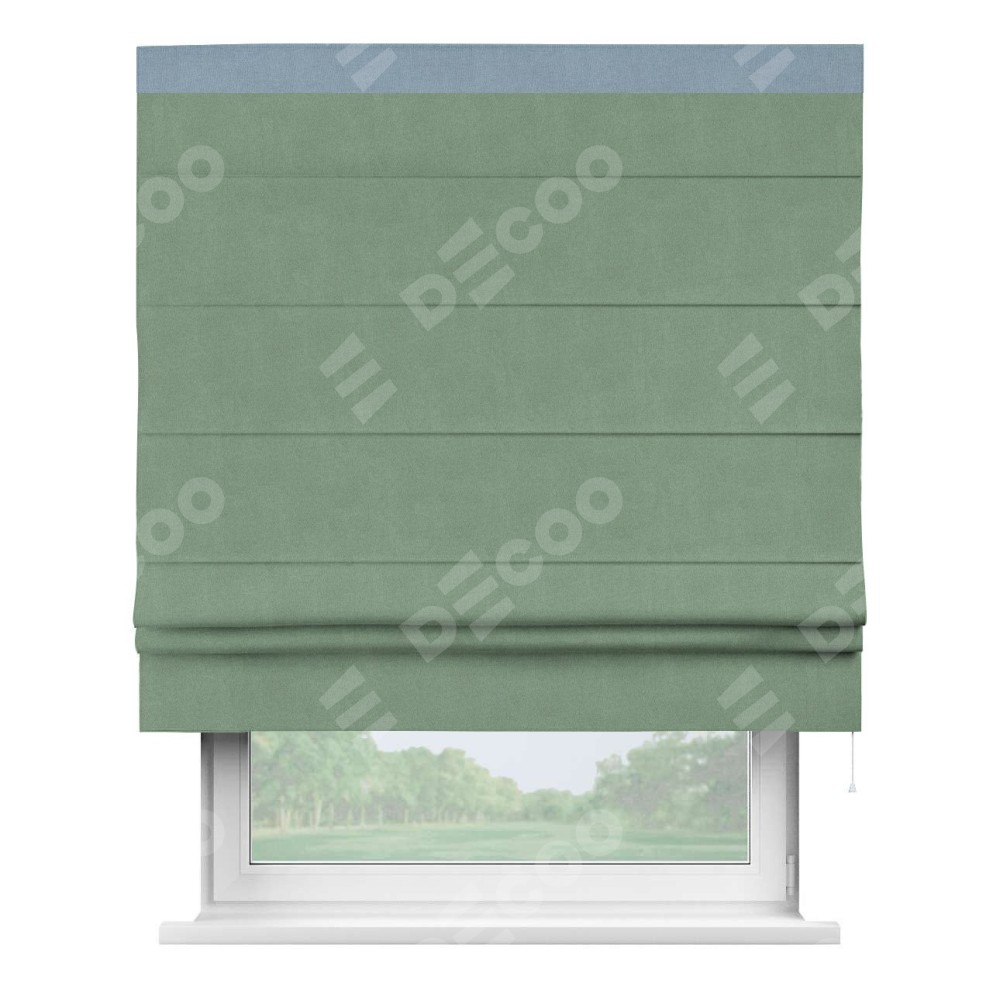 Римская штора производителя «Cortin», используется для проёма, пошита из ткани лён блэкаут светло-бирюзовый, артикул 69443. Отделка шторы кантом «Кинг», ткань для канта используется из льна разной расцветки на выбор. Имеет универсальный механизм и подходит для монтажа: на потолок, на стену и в нишу.