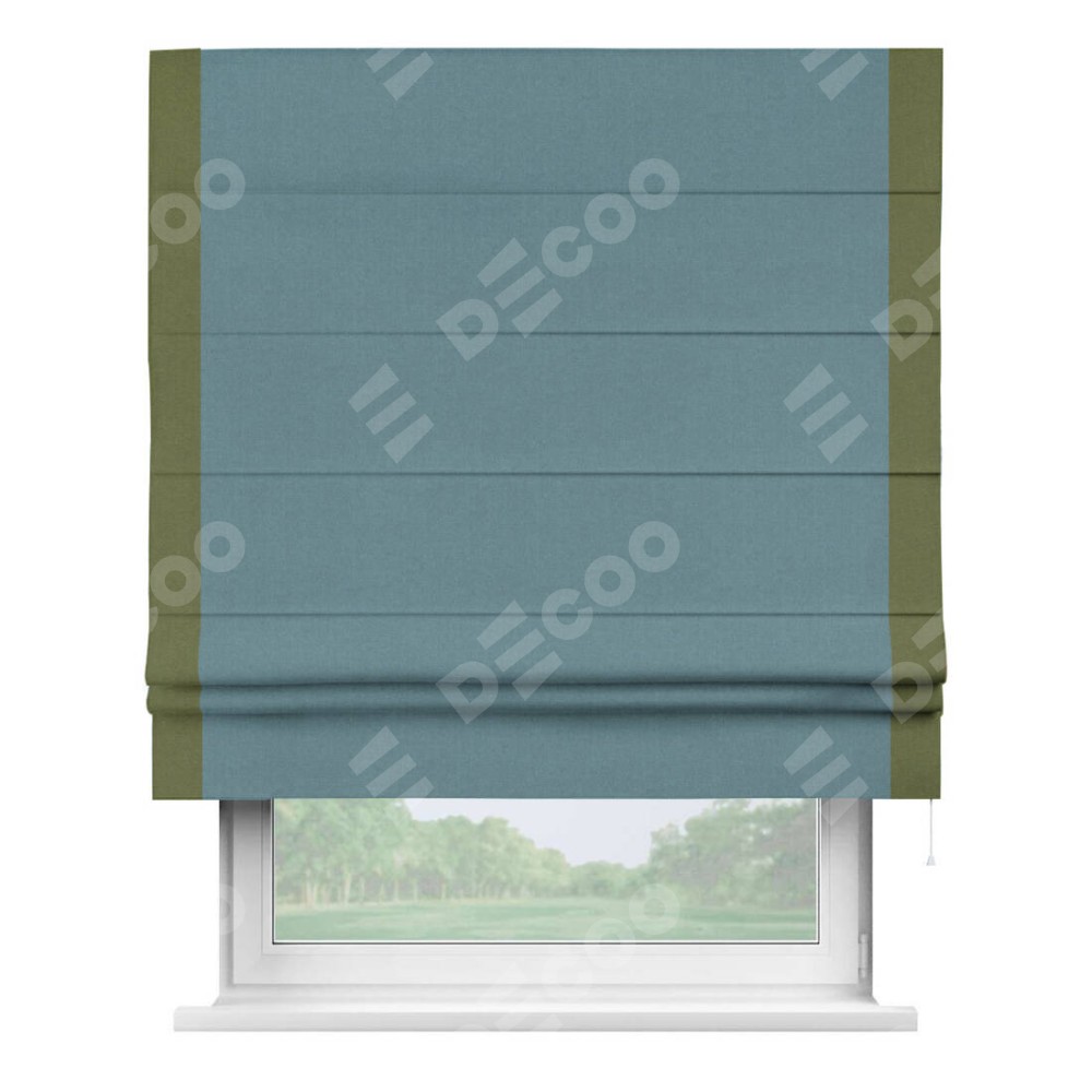 Римская штора производителя «Cortin», используется для проёма, пошита из ткани лён блэкаут синий, артикул 69528. Отделка шторы кантом «Стрим Дуо», ткань для канта используется из льна разной расцветки на выбор. Имеет универсальный механизм и подходит для монтажа: на потолок, на стену и в нишу.