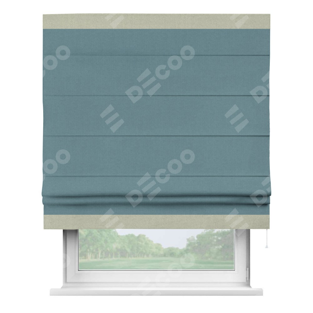 Римская штора производителя «Cortin», используется для проёма, пошита из ткани лён блэкаут синий, артикул 69528. Отделка шторы кантом «Горизонт», ткань для канта используется из льна разной расцветки на выбор. Имеет универсальный механизм и подходит для монтажа: на потолок, на стену и в нишу.