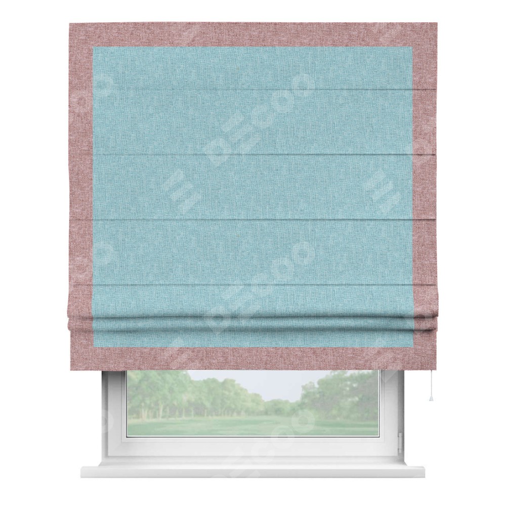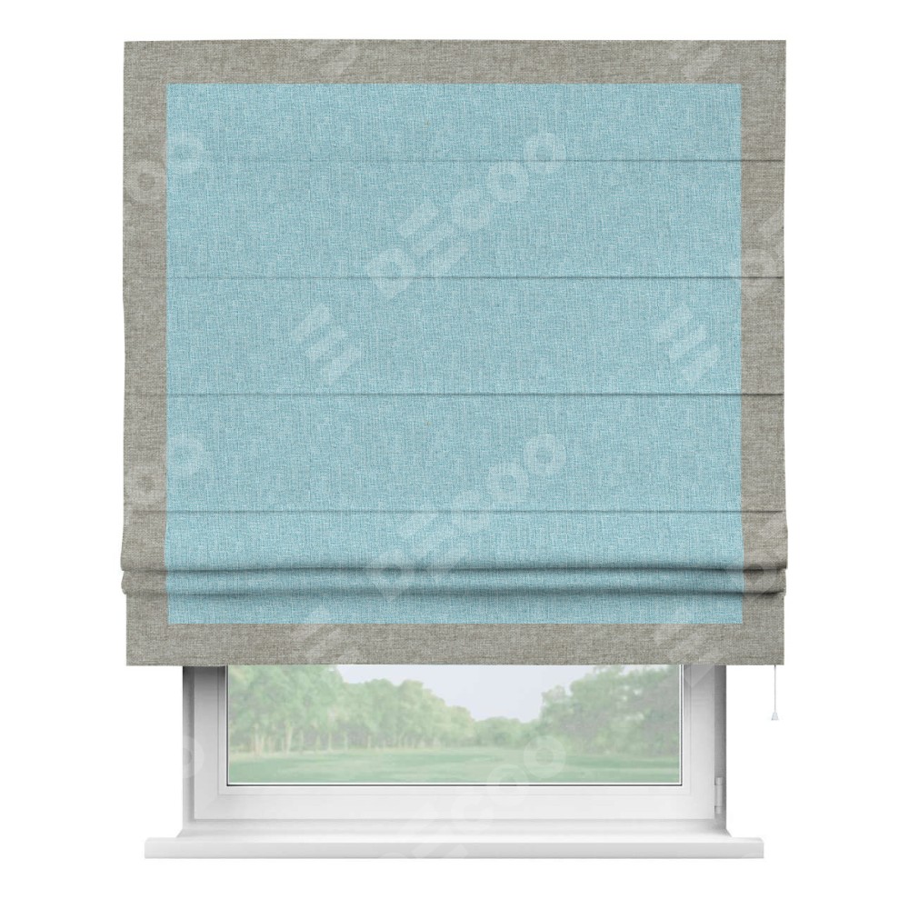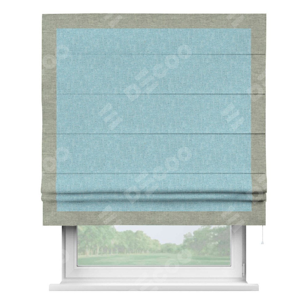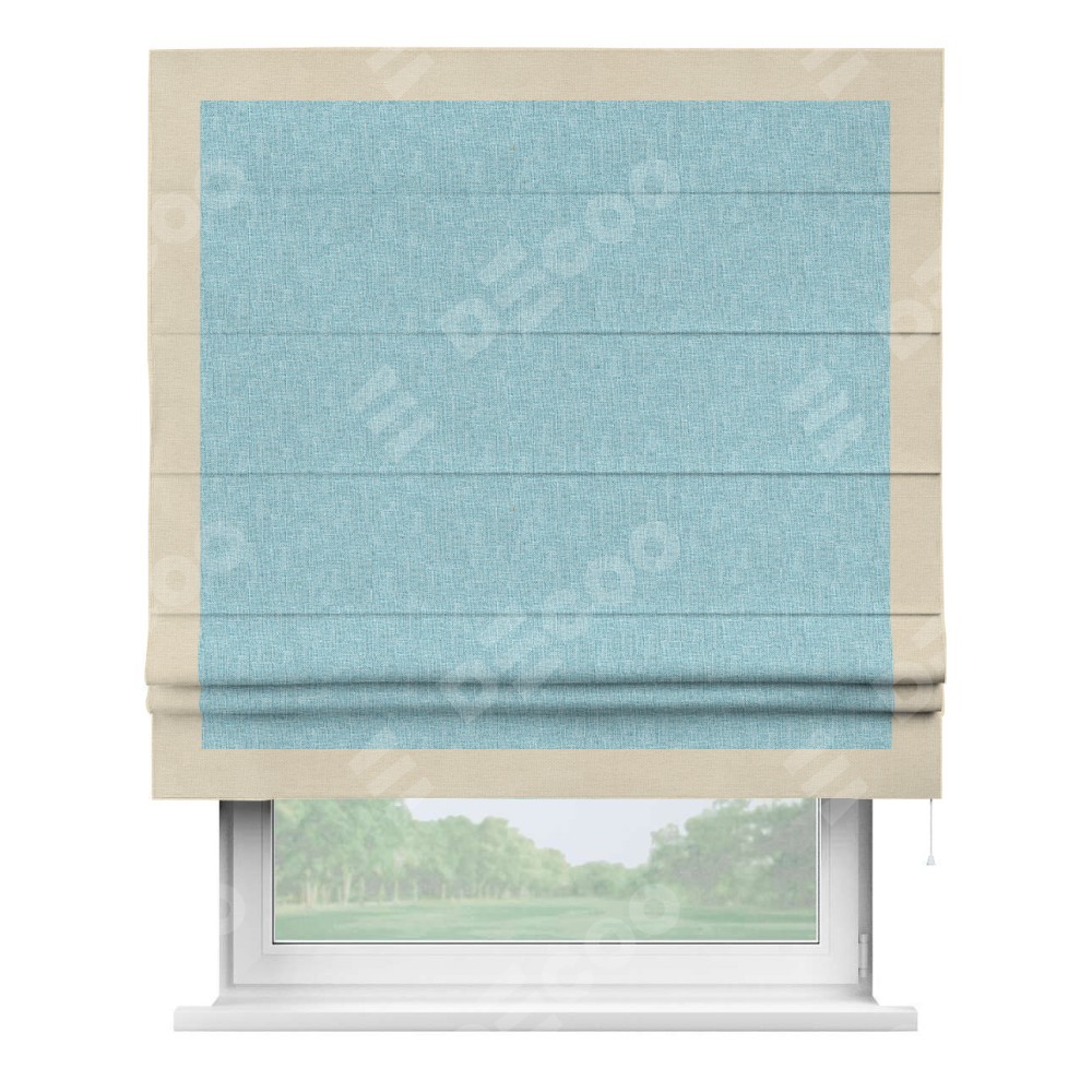 Римская штора производителя «Cortin», используется для проёма, пошита из ткани лён кашемир голубой, артикул 21616. Отделка шторы кантом «Чесс», ткань для канта используется из льна разной расцветки на выбор. Имеет универсальный механизм и подходит для монтажа: на потолок, на стену и в нишу.