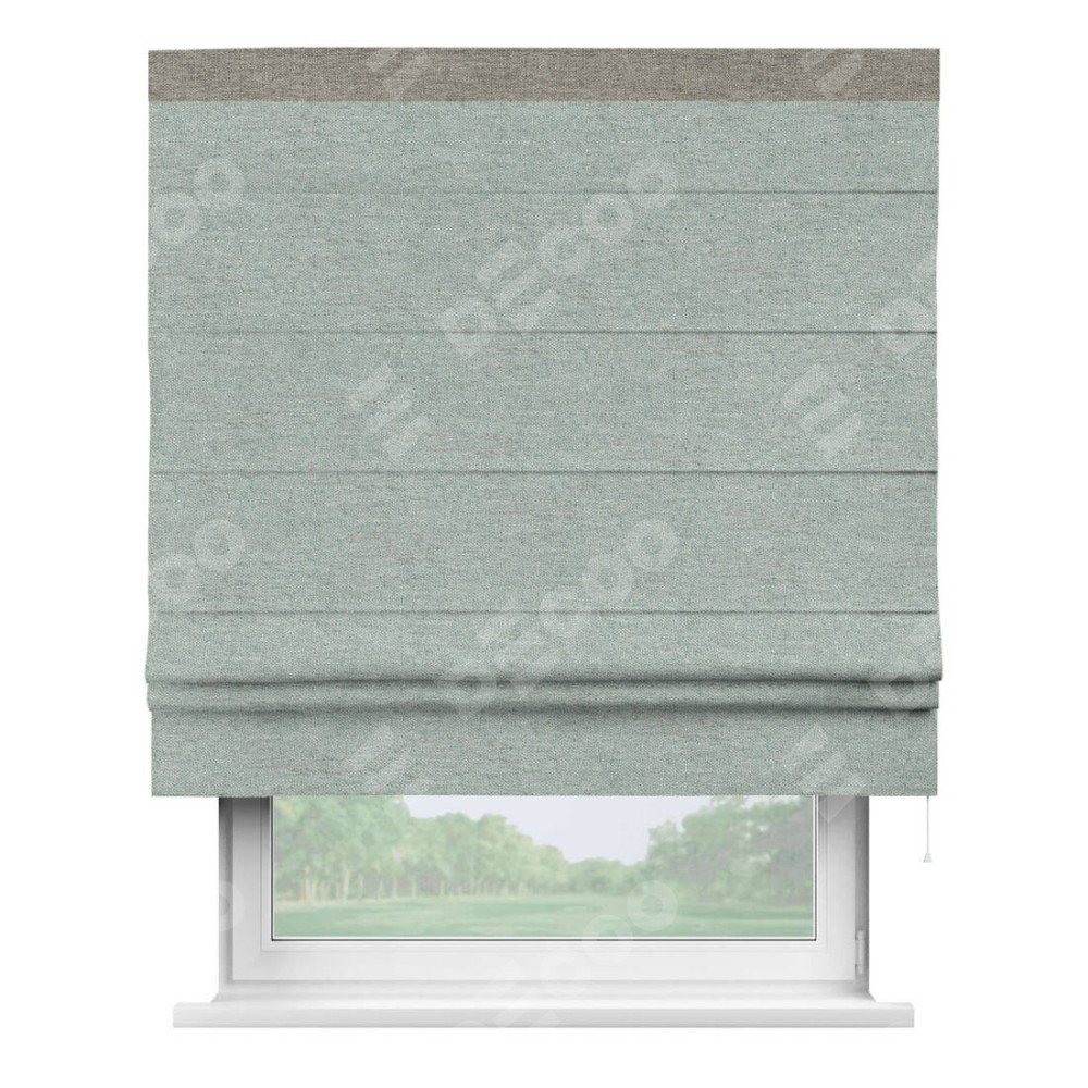 Римская штора производителя «Cortin», используется для проёма, пошита из ткани стиф димаут светло-серый, артикул 44025. Отделка шторы кантом «Кинг», ткань для канта используется из стифа разной расцветки на выбор. Имеет универсальный механизм и подходит для монтажа: на потолок, на стену и в нишу.