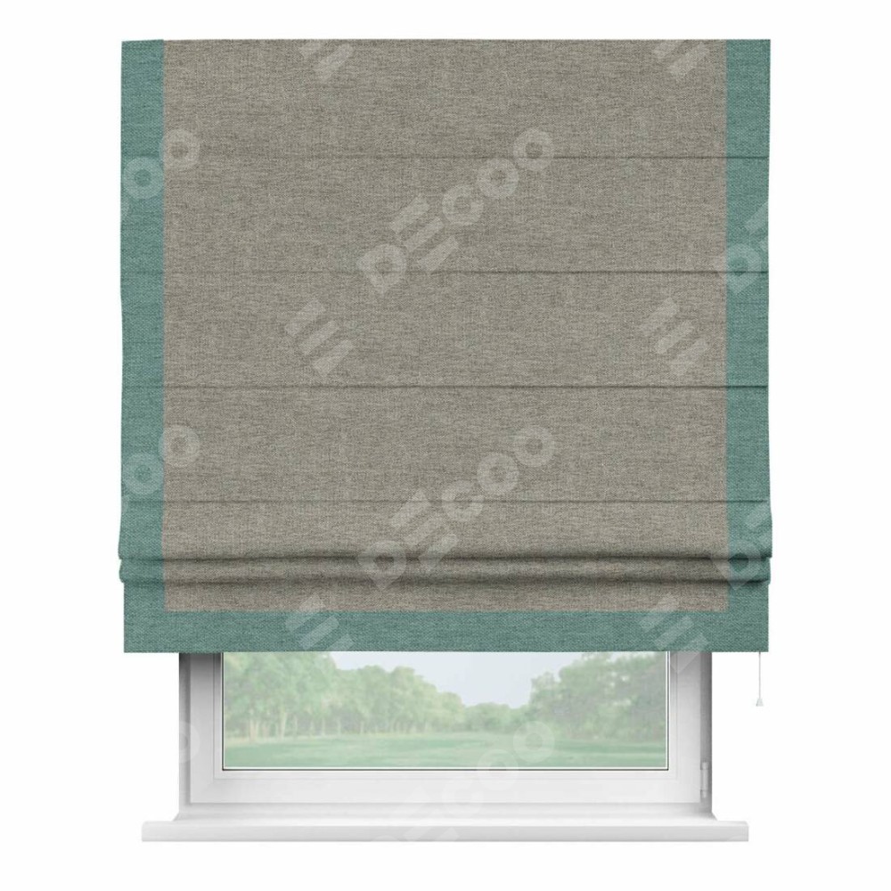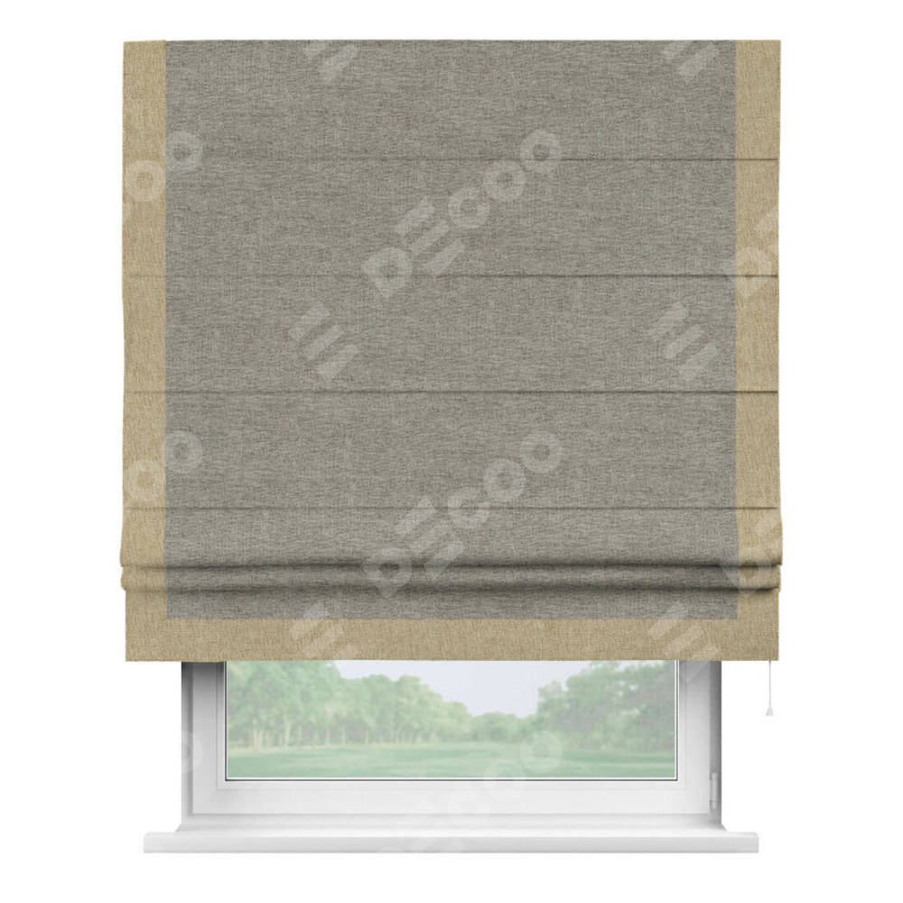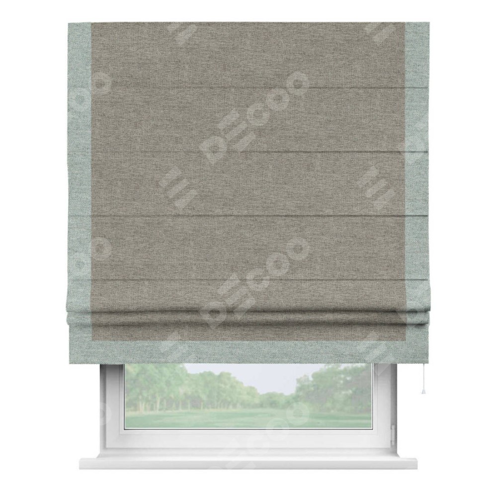 Римская штора производителя «Cortin», используется для проёма, пошита из ткани стиф димаут серо-коричневый, артикул 44028. Отделка шторы кантом «Виктория», ткань для канта используется из стифа разной расцветки на выбор. Имеет универсальный механизм и подходит для монтажа: на потолок, на стену и в нишу.