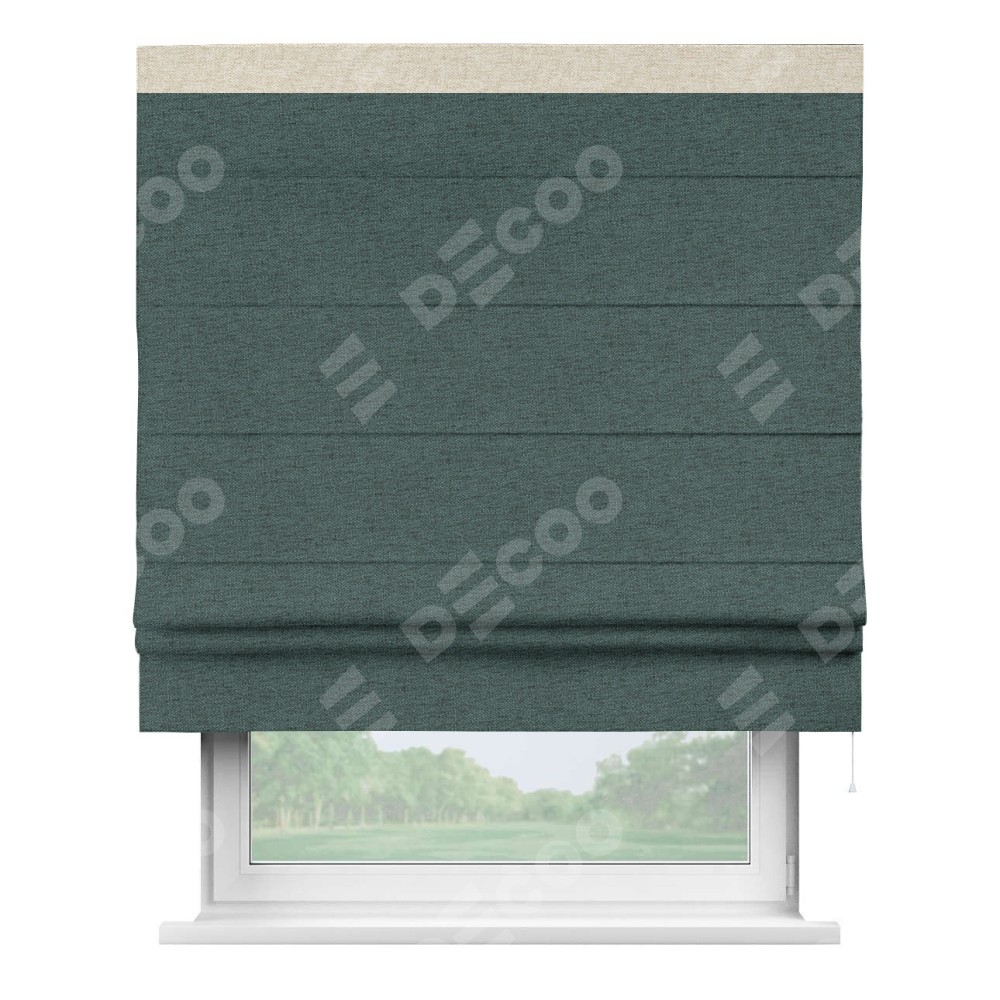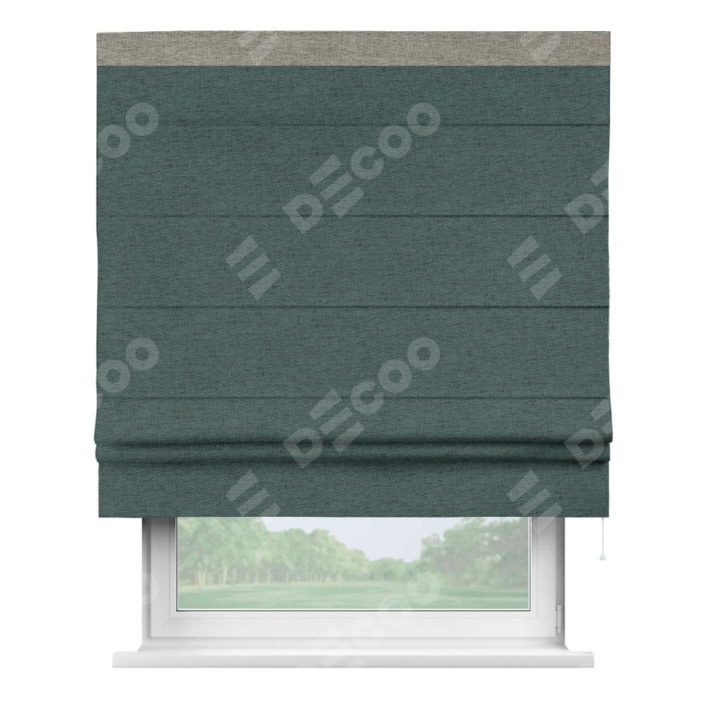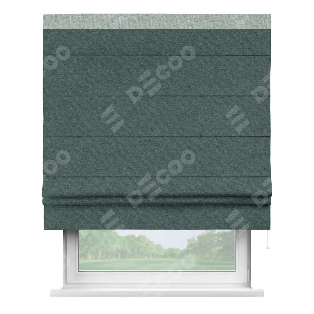 Римская штора производителя «Cortin», используется для проёма, пошита из ткани стиф димаут сине-зелёный, артикул 18194. Отделка шторы кантом «Кинг», ткань для канта используется из стифа разной расцветки на выбор. Имеет универсальный механизм и подходит для монтажа: на потолок, на стену и в нишу.