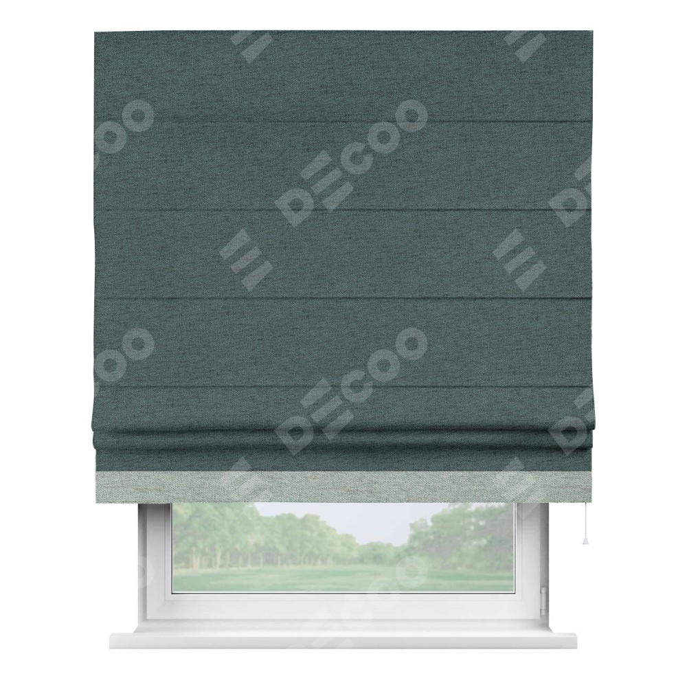 Римская штора производителя «Cortin», используется для проёма, пошита из ткани стиф димаут сине-зелёный, артикул 18194. Отделка шторы кантом «Джестер», ткань для канта используется из стифа разной расцветки на выбор. Имеет универсальный механизм и подходит для монтажа: на потолок, на стену и в нишу.