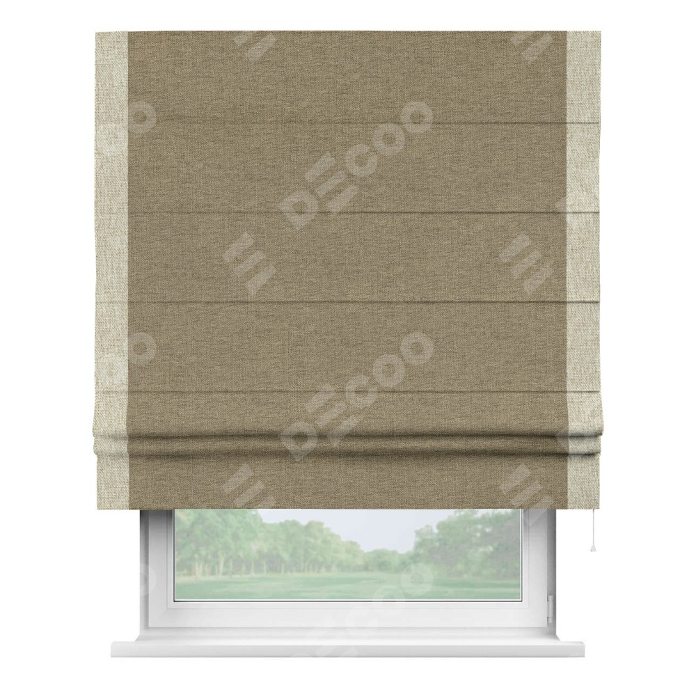 Римская штора производителя «Cortin», используется для проёма, пошита из ткани стиф димаут тёмно-бежевый, артикул 18085. Отделка шторы кантом «Стрим Дуо», ткань для канта используется из стифа разной расцветки на выбор. Имеет универсальный механизм и подходит для монтажа: на потолок, на стену и в нишу.