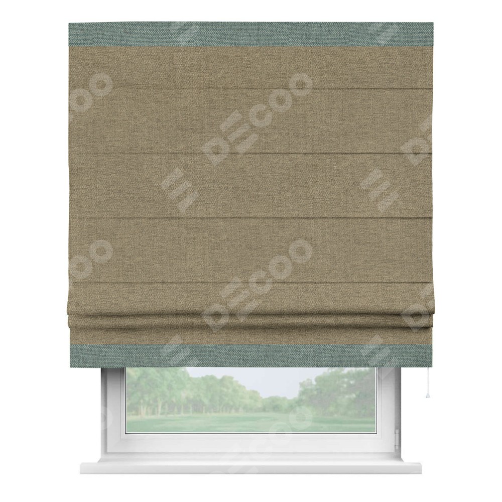 Римская штора производителя «Cortin», используется для проёма, пошита из ткани стиф димаут тёмно-бежевый, артикул 18085. Отделка шторы кантом «Горизонт», ткань для канта используется из стифа разной расцветки на выбор. Имеет универсальный механизм и подходит для монтажа: на потолок, на стену и в нишу.
