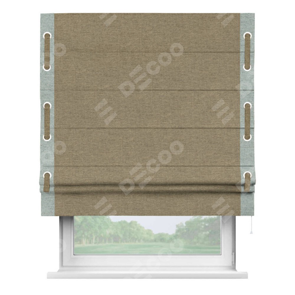 Римская штора производителя «Cortin», используется для проёма, пошита из ткани стиф димаут тёмно-бежевый, артикул 18085. Отделка шторы кантом «Стрим Дуо» на кантах расположены люверсы с пояском, ткань для канта используется из стифа разной расцветки на выбор. Ткань для пояска обычно используется из основной ткани шторы, а так же можно сделать из любой расцветки по желанию. Имеет универсальный механизм и подходит для монтажа: на потолок, на стену и в нишу.