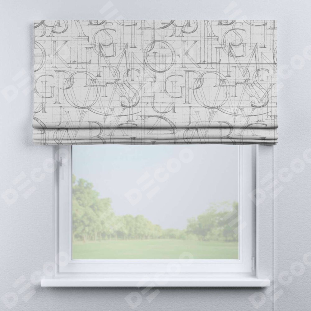 Римская штора производителя «Cortin», используется для проёма, пошита из ткани блэкаут с нанесением сублимационной печати «Античные буквы». Имеет универсальный механизм и подходит для монтажа: на потолок, на стену и в нишу.