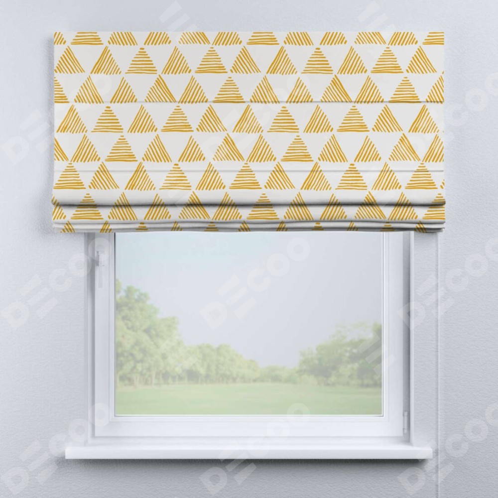 Римская штора производителя «Cortin», используется для проёма, пошита из ткани блэкаут с нанесением сублимационной печати «Желтые треугольники». Имеет универсальный механизм и подходит для монтажа: на потолок, на стену и в нишу.