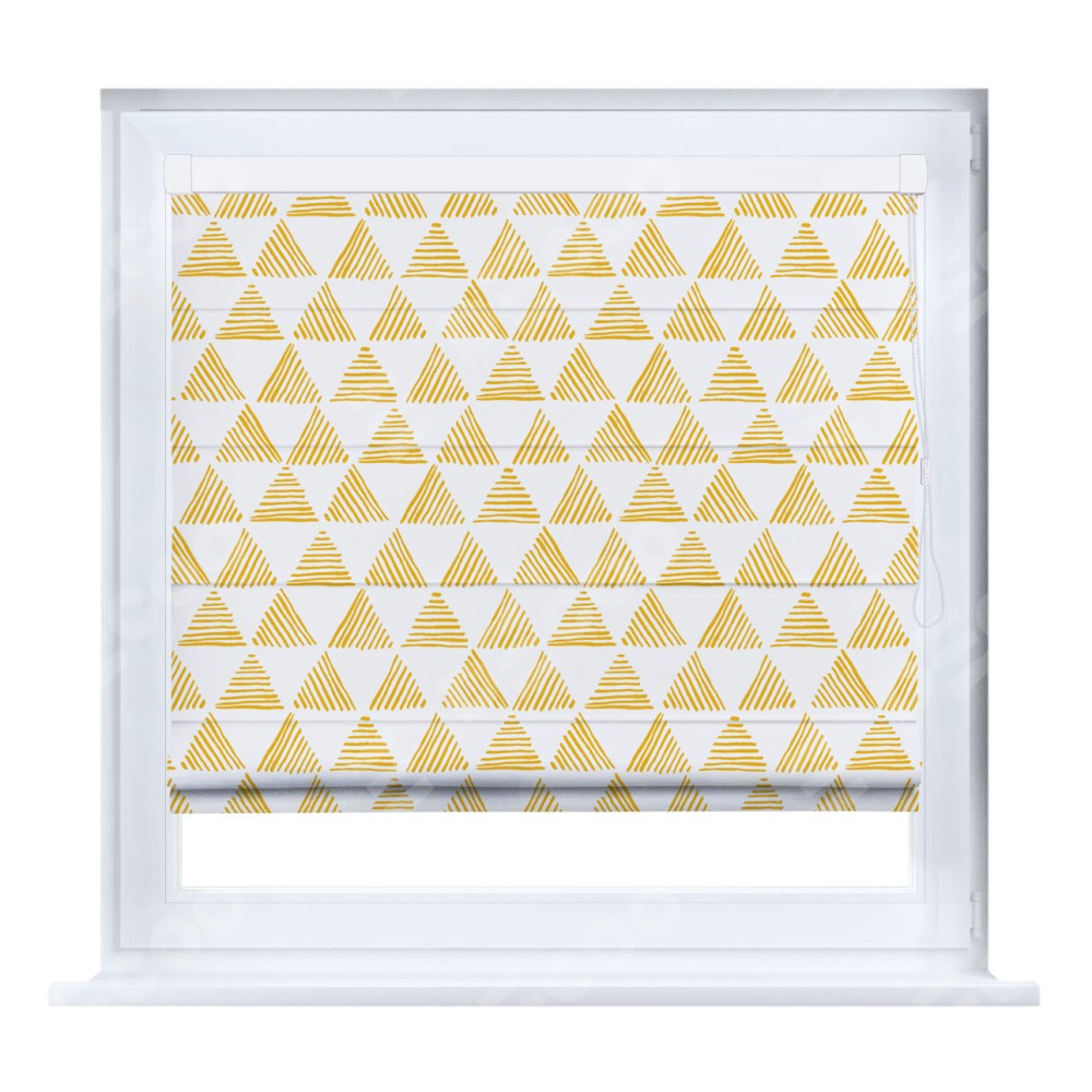 Римская штора производителя «Cortin», устанавливается на створку окна, пошита из ткани блэкаут с нанесением сублимационной печати «Желтые треугольники». Штора шьётся по индивидуальным размерам, для данного типа римской шторы возможная ширина от 35 до 150 см., высота до 250 см.