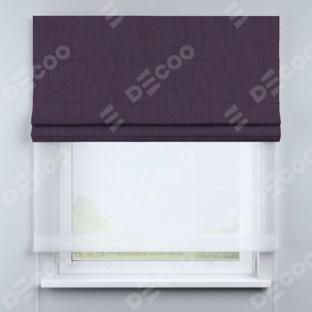 Римская штора день-ночь производителя «Cortin», используется для проёма, пошита из двух полотен, с лицевой стороны канвас баклажановый артикул v-111, вторая ткань тюль (по стандарту комплектуется тюль белого цвета артикул V-01). Имеет универсальный механизм и подходит для монтажа: на потолок, на стену и в нишу.