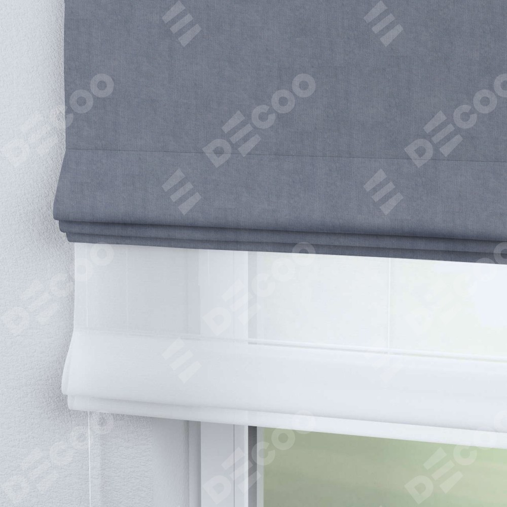 Римская штора день-ночь производителя «Cortin», используется для проёма, пошита из двух полотен, с лицевой стороны канвас васильковый артикул v-203, вторая ткань тюль (по стандарту комплектуется тюль белого цвета артикул V-01). Имеет универсальный механизм и подходит для монтажа: на потолок, на стену и в нишу.