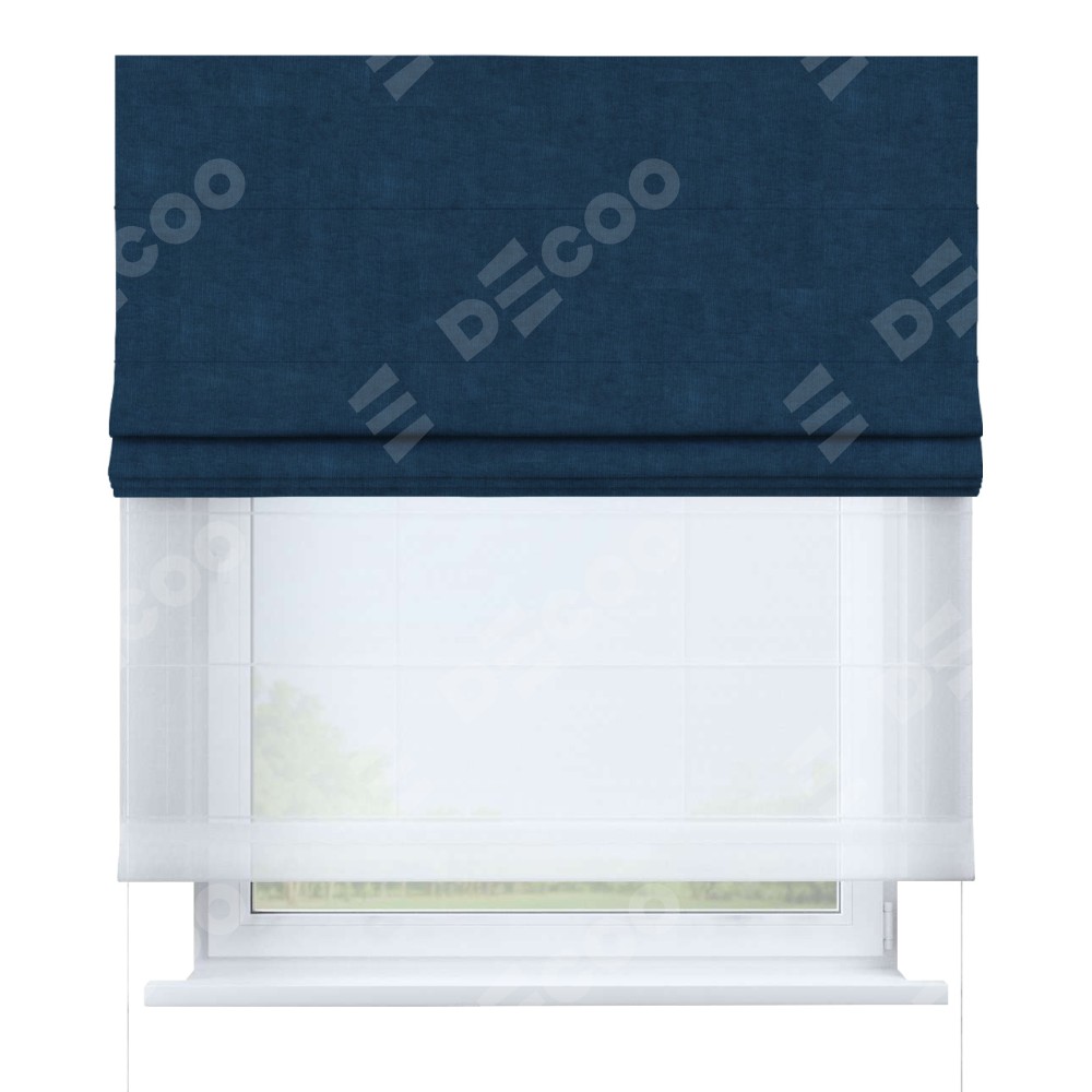 Римская штора день-ночь производителя «Cortin», используется для проёма, пошита из двух полотен, с лицевой стороны канвас синий артикул v-573, вторая ткань тюль (по стандарту комплектуется тюль белого цвета артикул V-01). Имеет универсальный механизм и подходит для монтажа: на потолок, на стену и в нишу.