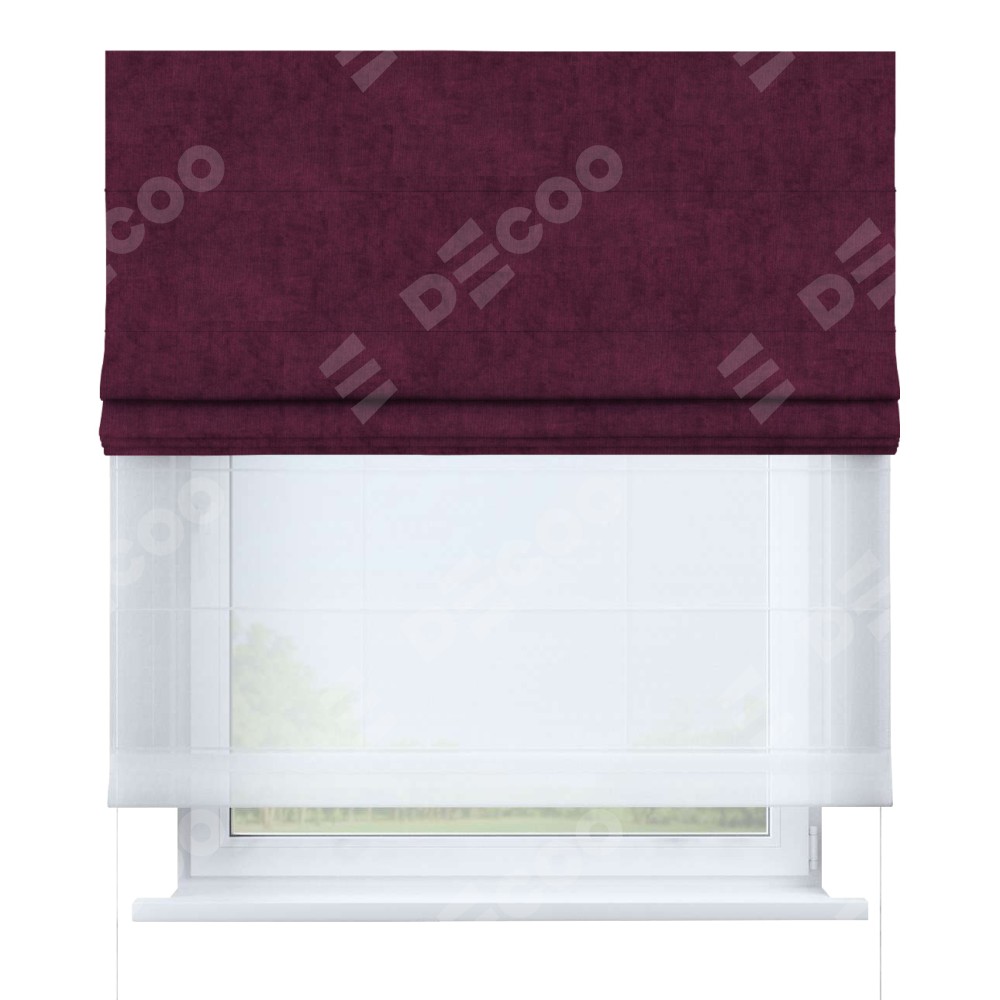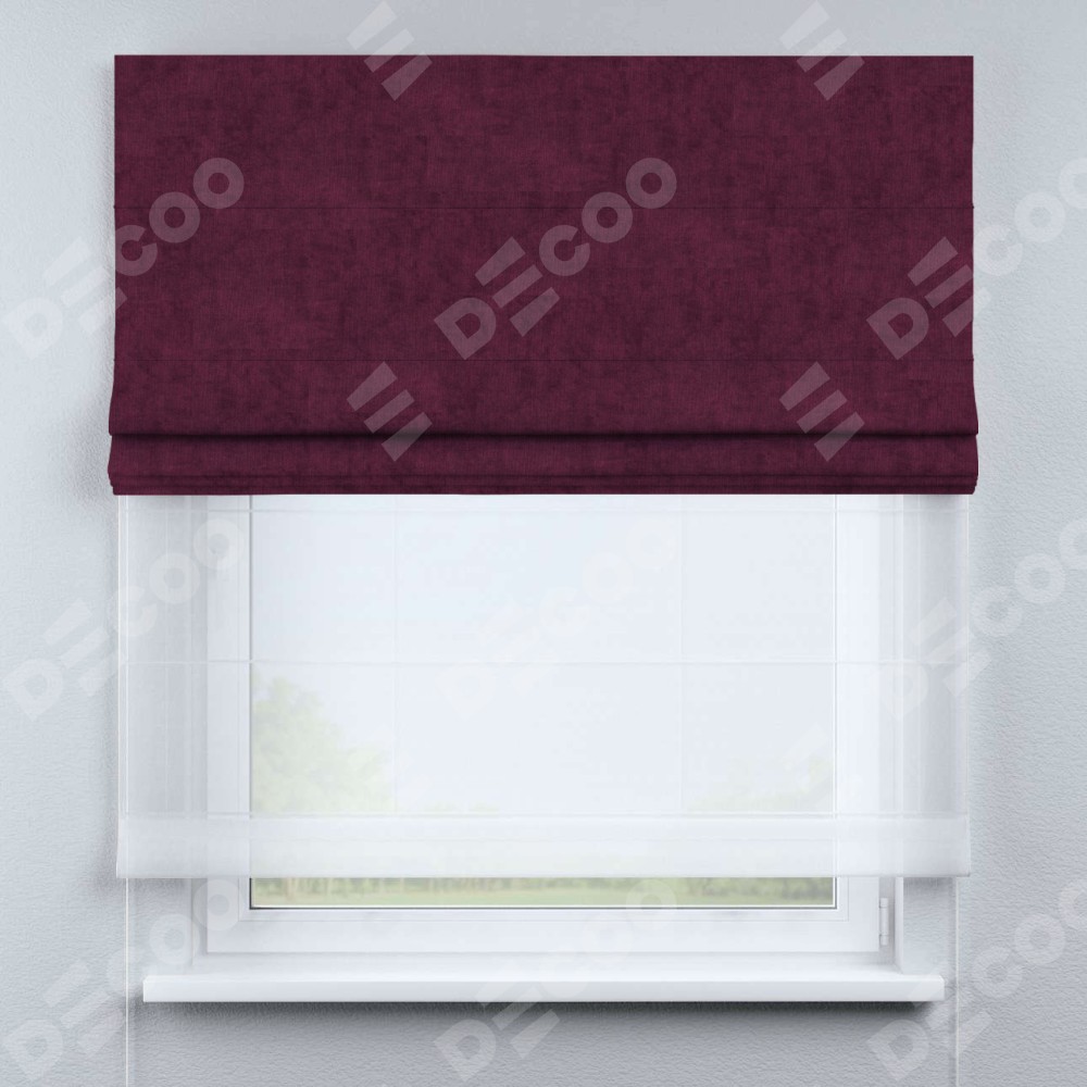 Римская штора день-ночь производителя «Cortin», используется для проёма, пошита из двух полотен, с лицевой стороны канвас фиолетовый артикул v-99, вторая ткань тюль (по стандарту комплектуется тюль белого цвета артикул V-01). Имеет универсальный механизм и подходит для монтажа: на потолок, на стену и в нишу.