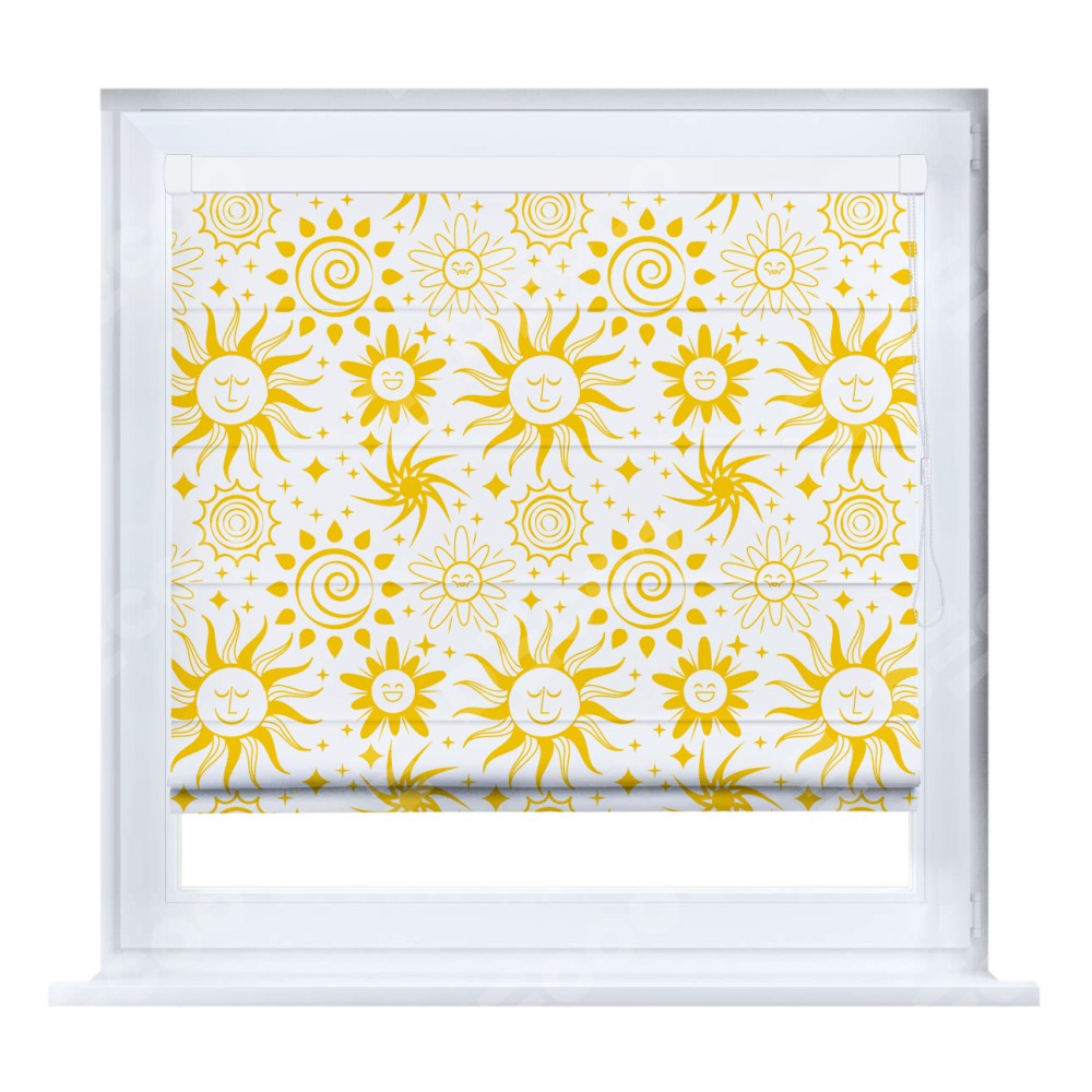 Римская штора производителя «Cortin», устанавливается на створку окна, пошита из ткани блэкаут с нанесением сублимационной печати «Солнышки». Штора шьётся по индивидуальным размерам, для данного типа римской шторы возможная ширина от 35 до 150 см., высота до 250 см.