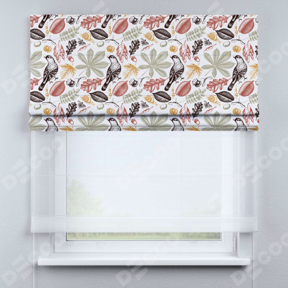Римская штора день-ночь производителя «Cortin», используется для проёма, пошита из двух полотен, с лицевой блэкаут с нанесением сублимационной печати «Краски осени», вторая ткань тюль (по стандарту комплектуется тюль белого цвета артикул V-01). Имеет универсальный механизм и подходит для монтажа: на потолок, на стену и в нишу.