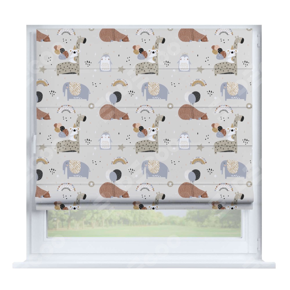 Римская штора производителя «Cortin», устанавливается на створку окна, пошита из ткани блэкаут с нанесением сублимационной печати «Вечеринка животных». Штора шьётся по индивидуальным размерам, для данного типа римской шторы возможная ширина от 35 до 150 см., высота до 250 см.