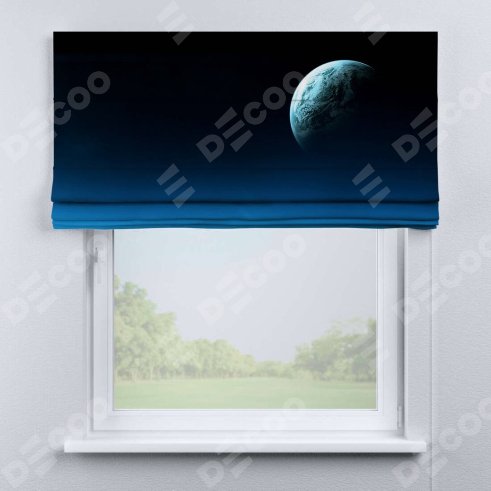 Римская штора производителя «Cortin», используется для проёма, пошита из ткани блэкаут с нанесением сублимационной печати «Горизонты вселенной». Имеет универсальный механизм и подходит для монтажа: на потолок, на стену и в нишу.