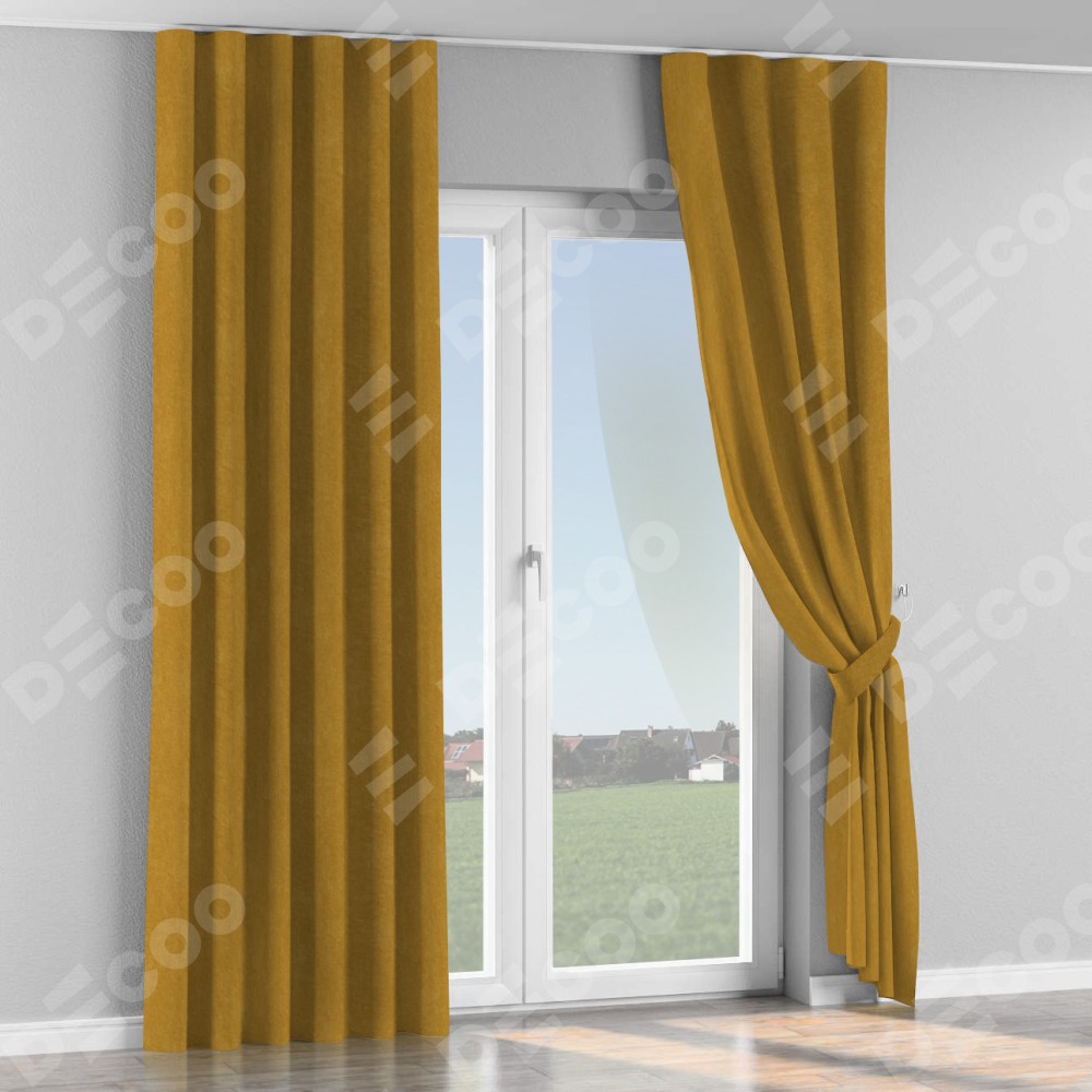 Комплект прямых штор, от производителя «Cortin», пошиты из ткани канвас горчица, артикул ткани v-476. С изнаночной стороны в верхней части штор пристрачивается шторная лента с декоративными складками «Волна». Для создания элегантных складок прямые шторы шьются по стандарту с коэффициентом 1:2 (на 100 см. ширины проёма 200 см. ширины ткани).