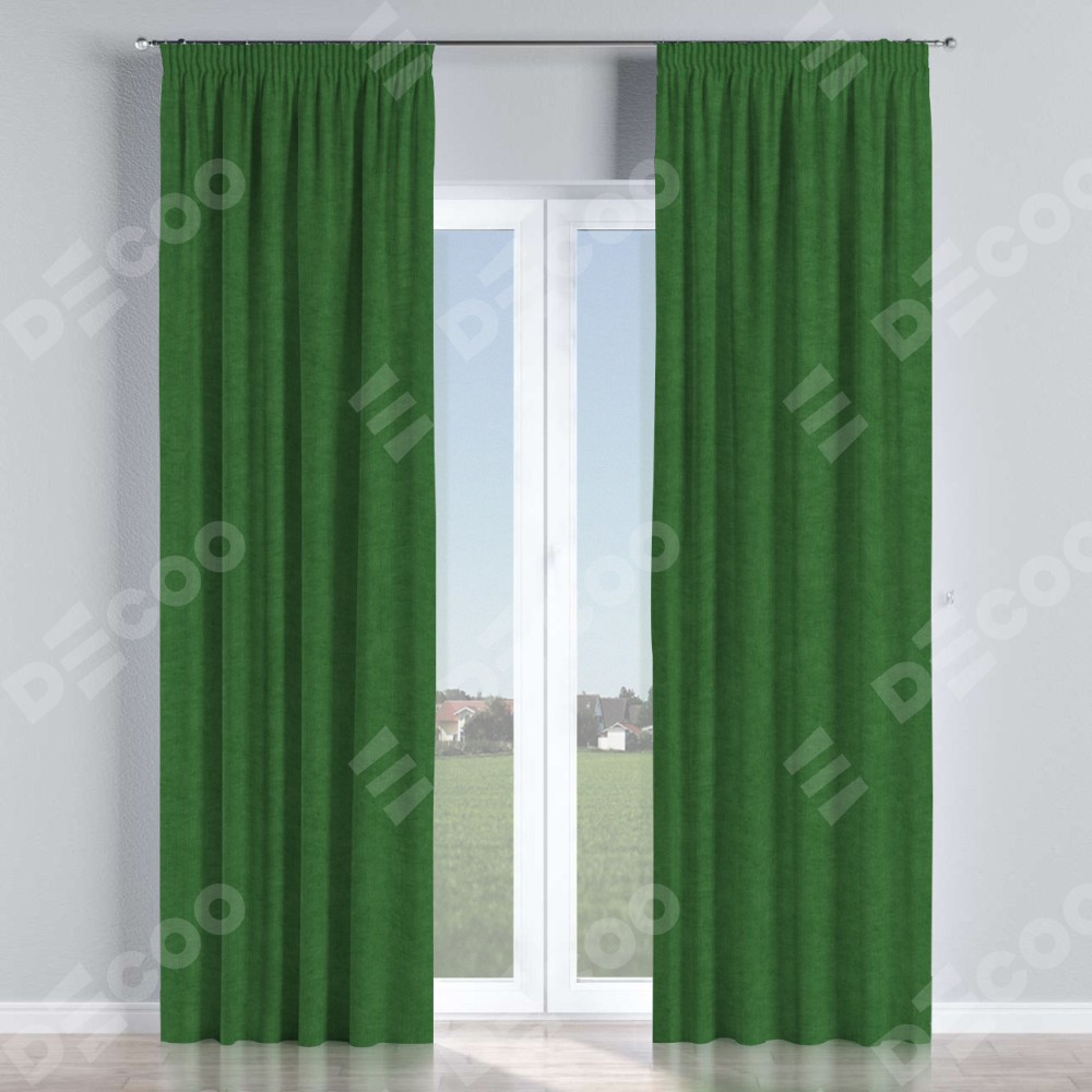 Комплект прямых штор, от производителя «Cortin», пошиты из ткани канвас зелёный, артикул ткани v-16. С изнаночной стороны в верхней части штор пристрачивается шторная лента с декоративными складками «Карандаш». Для создания элегантных складок прямые шторы шьются по стандарту с коэффициентом 1:2 (на 100 см. ширины проёма 200 см. ширины ткани).