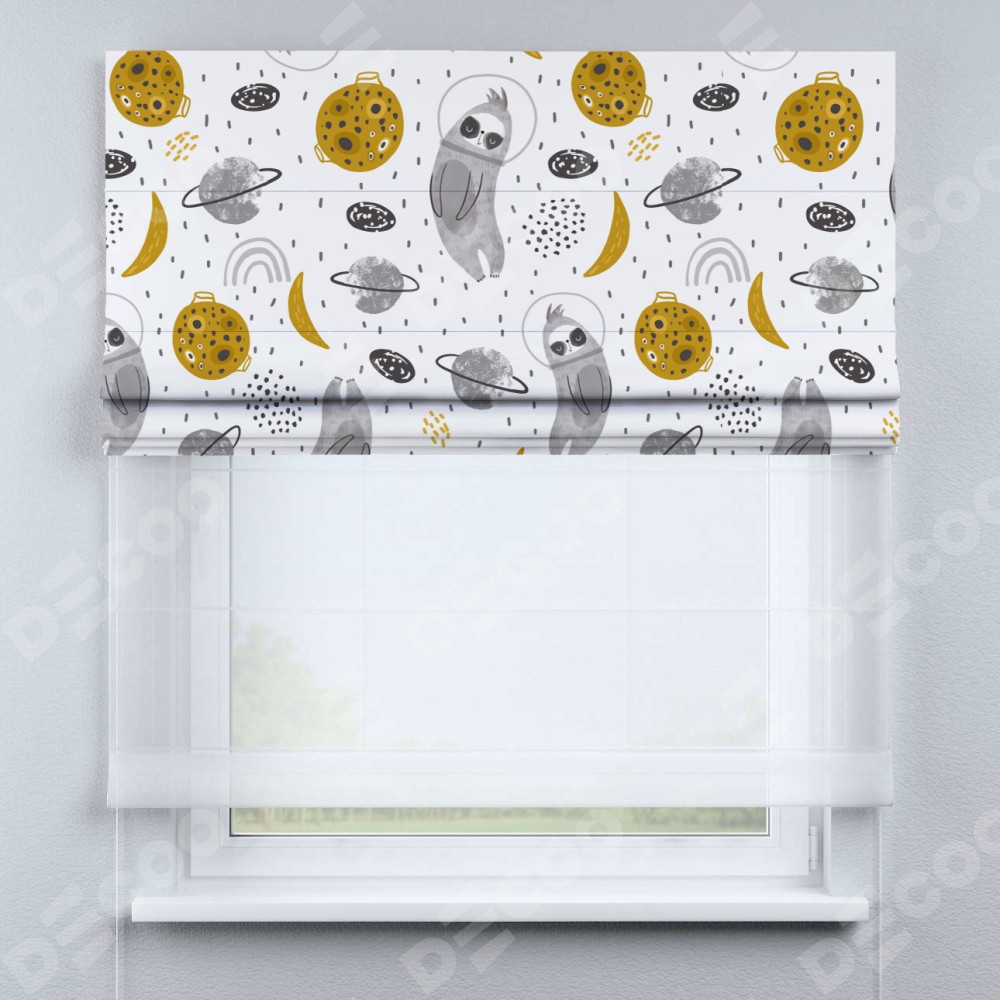 Римская штора день-ночь производителя «Cortin», используется для проёма, пошита из двух полотен, с лицевой блэкаут с нанесением сублимационной печати «Ленивец в шлеме», вторая ткань тюль (по стандарту комплектуется тюль белого цвета артикул V-01). Имеет универсальный механизм и подходит для монтажа: на потолок, на стену и в нишу.