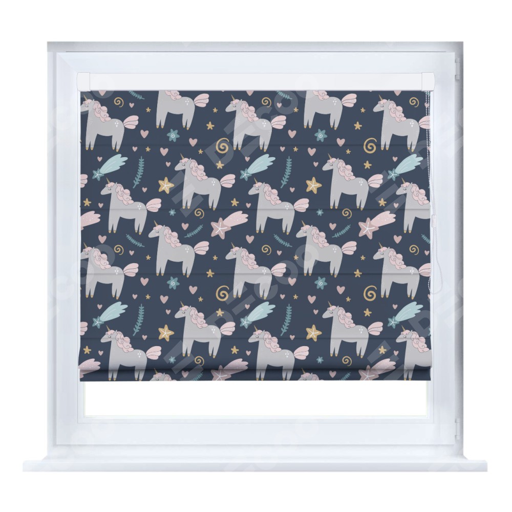 Римская штора кассетного типа, производителя «Cortin», устанавливается только на пластиковые окна и прилегает к стеклопакету, пошита из ткани блэкаут с нанесением сублимационной печати «Милые единороги».