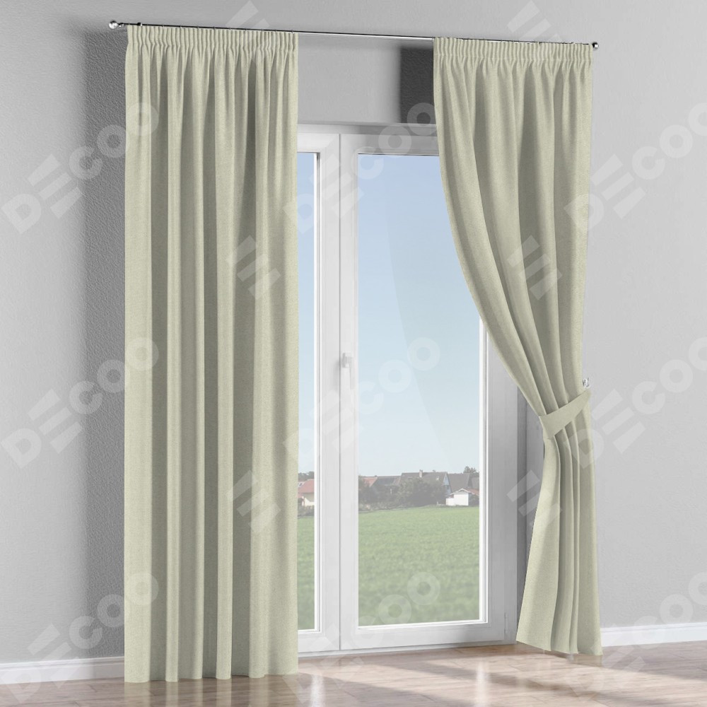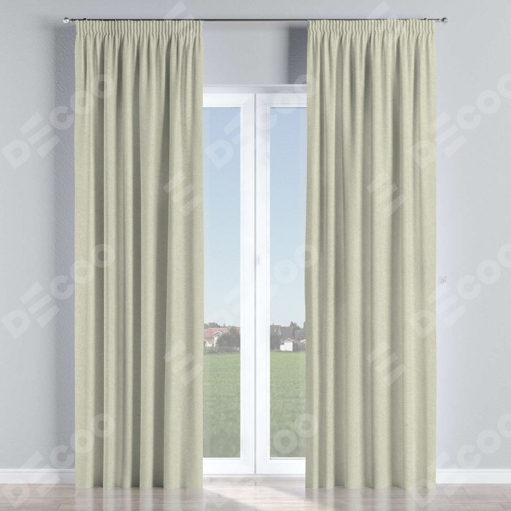 Комплект прямых штор, от производителя «Cortin», пошиты из ткани твид блэкаут шампань, артикул ткани 90929. С изнаночной стороны в верхней части штор пристрачивается шторная лента с декоративными складками «Карандаш». Для создания элегантных складок прямые шторы шьются по стандарту с коэффициентом 1:2 (на 100 см. ширины проёма 200 см. ширины ткани).