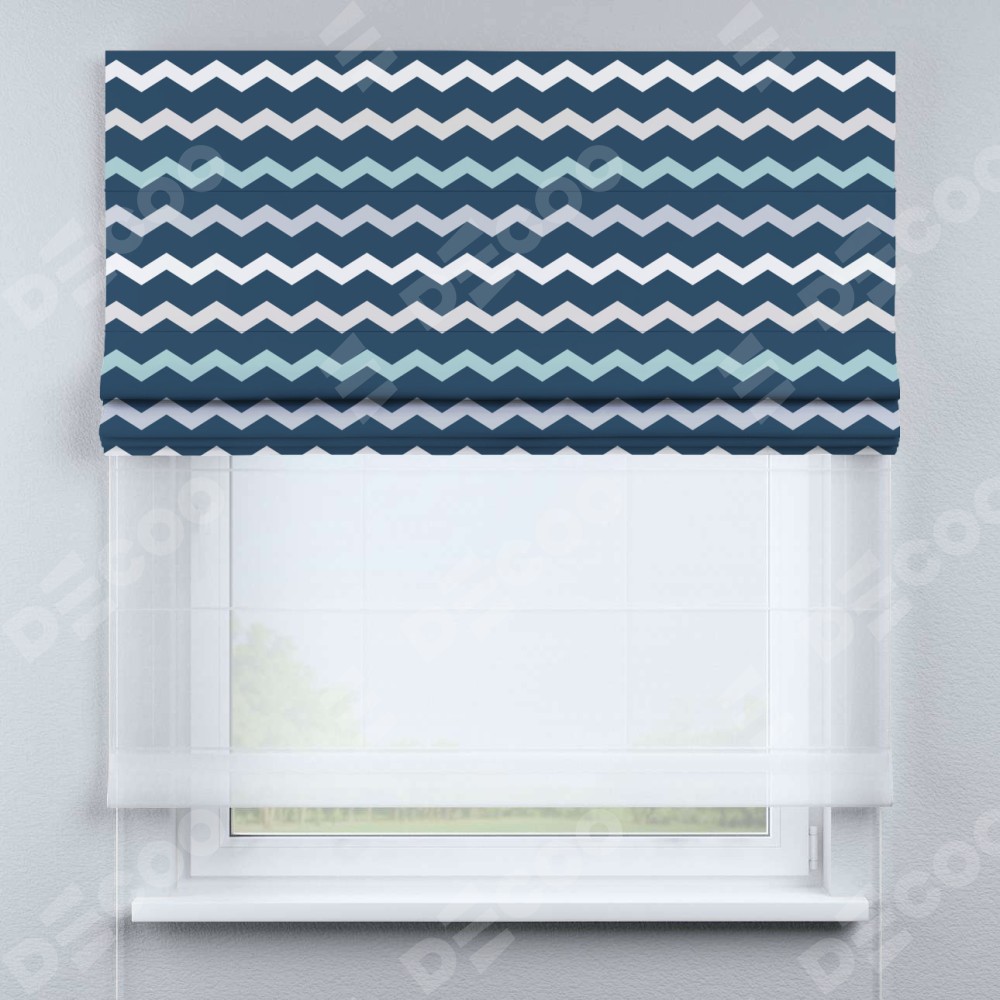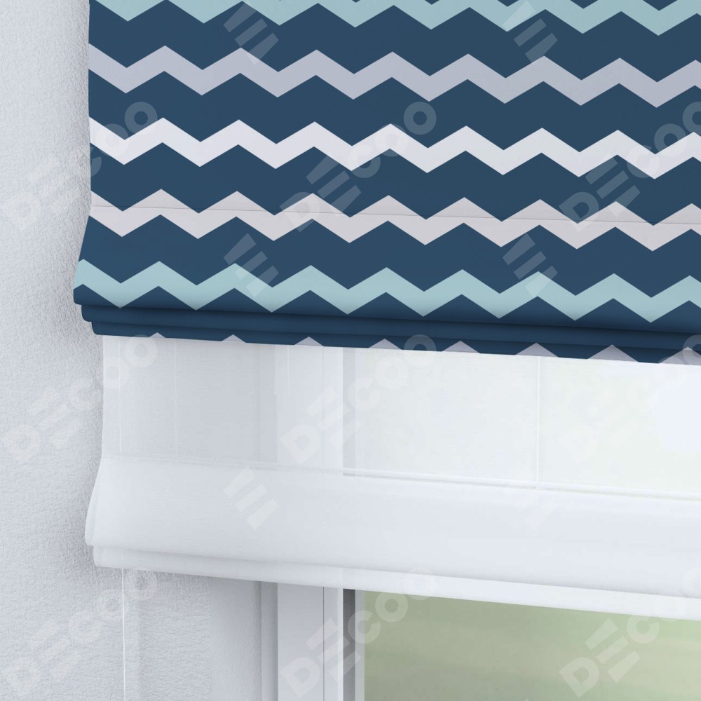Римская штора день-ночь производителя «Cortin», используется для проёма, пошита из двух полотен, с лицевой блэкаут с нанесением сублимационной печати «Морской шеврон», вторая ткань тюль (по стандарту комплектуется тюль белого цвета артикул V-01). Имеет универсальный механизм и подходит для монтажа: на потолок, на стену и в нишу.