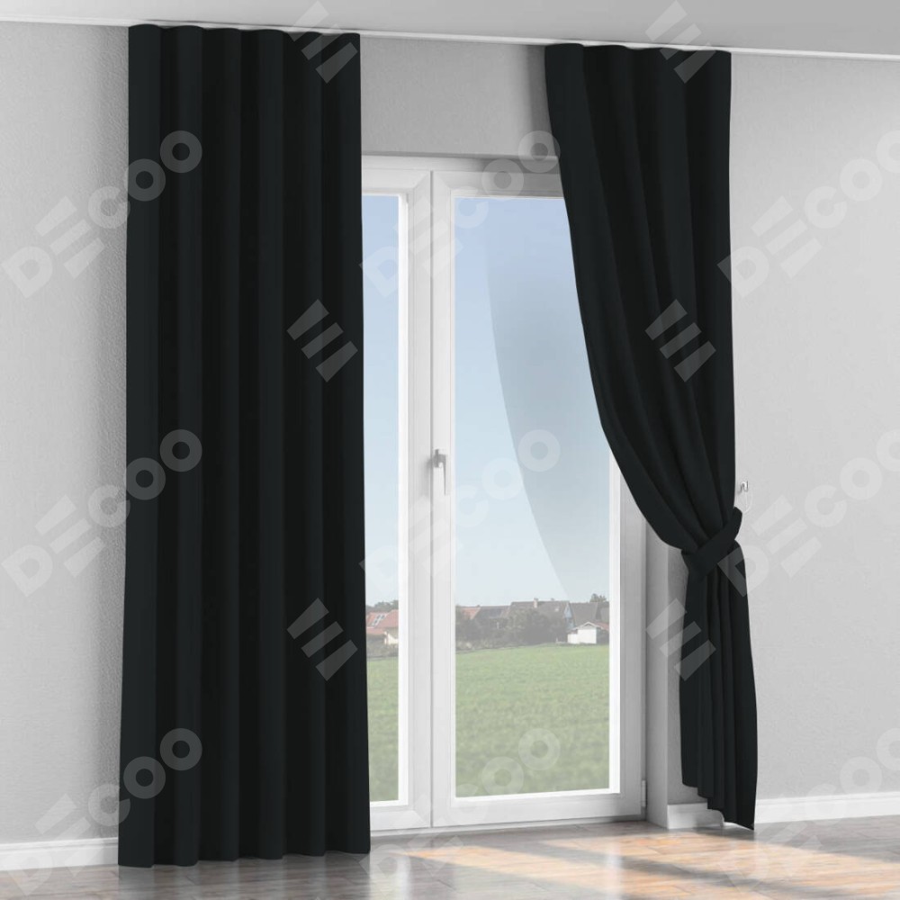 Комплект прямых штор, от производителя «Cortin», пошиты из ткани блэкаут однотонный черный, артикул ткани 91571−2. С изнаночной стороны в верхней части штор пристрачивается шторная лента с декоративными складками «Волна». Для создания элегантных складок прямые шторы шьются по стандарту с коэффициентом 1:2 (на 100 см. ширины проёма 200 см. ширины ткани).