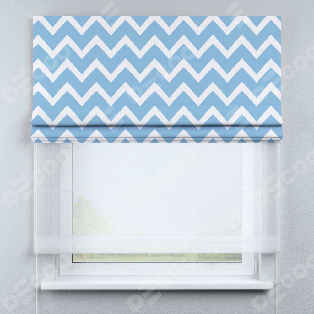 Римская штора день-ночь производителя «Cortin», используется для проёма, пошита из двух полотен, с лицевой блэкаут с нанесением сублимационной печати «Зигзаг средний», вторая ткань тюль (по стандарту комплектуется тюль белого цвета артикул V-01). Имеет универсальный механизм и подходит для монтажа: на потолок, на стену и в нишу.