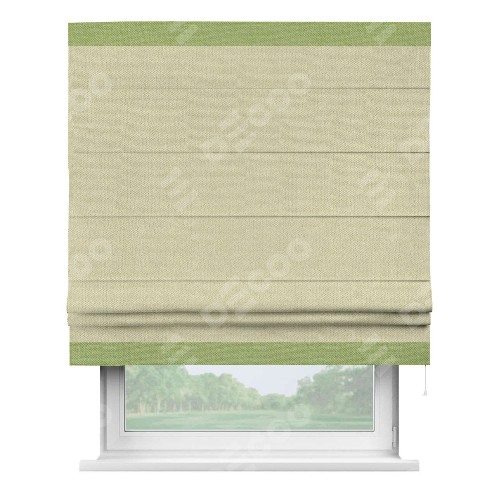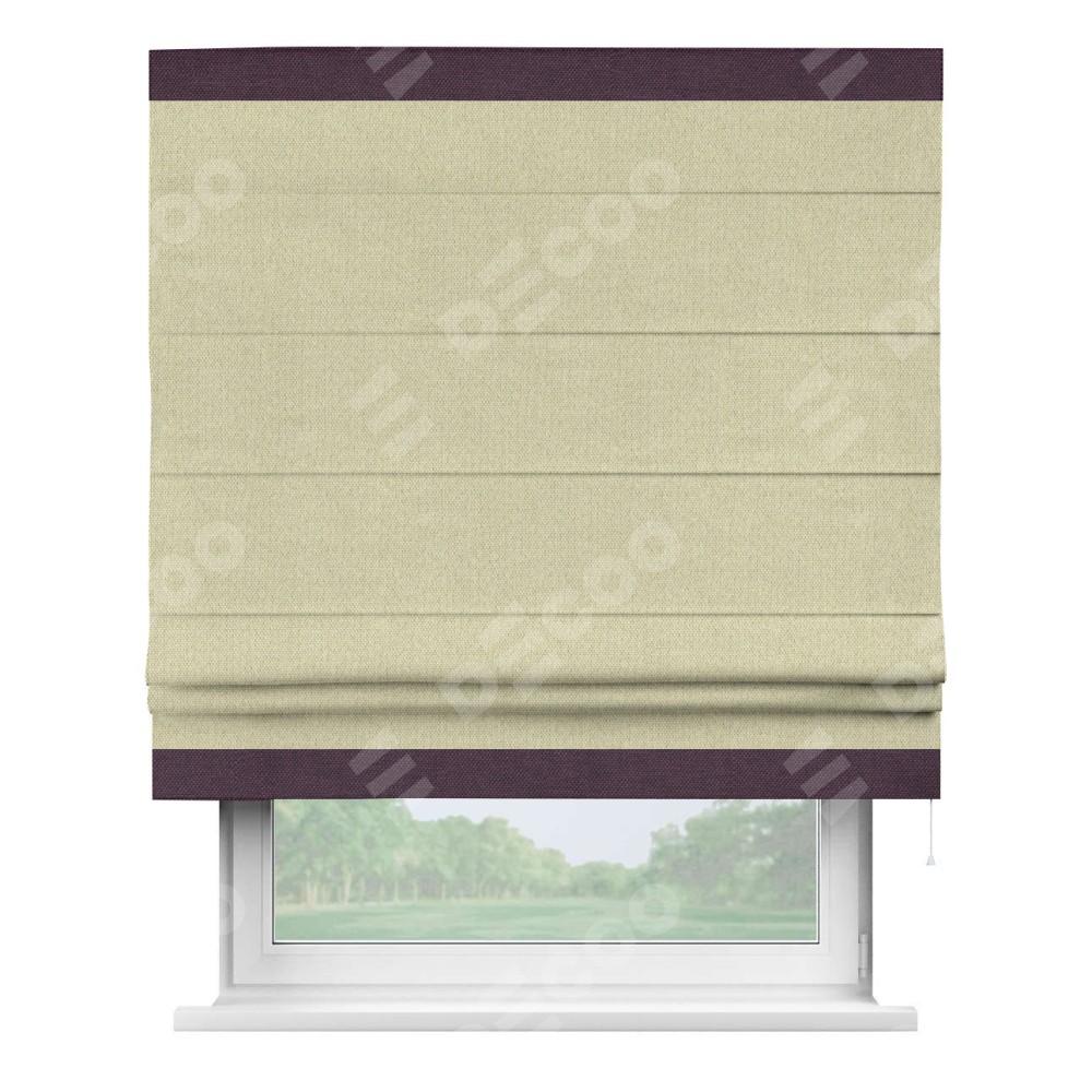 Римская штора производителя «Cortin», используется для проёма, пошита из ткани лён димаут шампань, артикул 90994. Отделка шторы кантом «Горизонт», ткань для канта используется из льна димаут разной расцветки на выбор. Имеет универсальный механизм и подходит для монтажа: на потолок, на стену и в нишу.