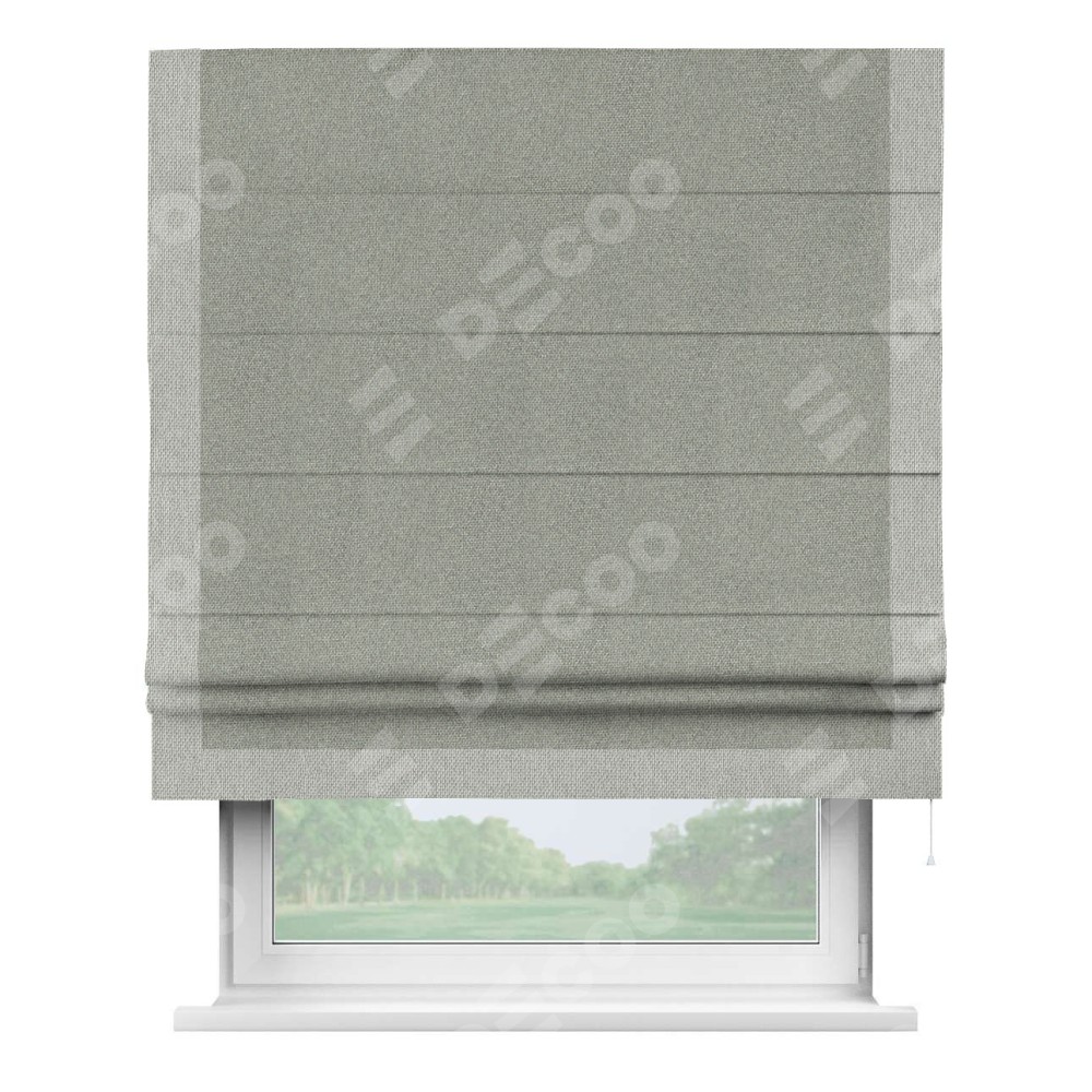 Римская штора производителя «Cortin», используется для проёма, пошита из ткани лён димаут серый, артикул 91009. Отделка шторы кантом «Виктория», ткань для канта используется из льна димаут разной расцветки на выбор. Имеет универсальный механизм и подходит для монтажа: на потолок, на стену и в нишу.