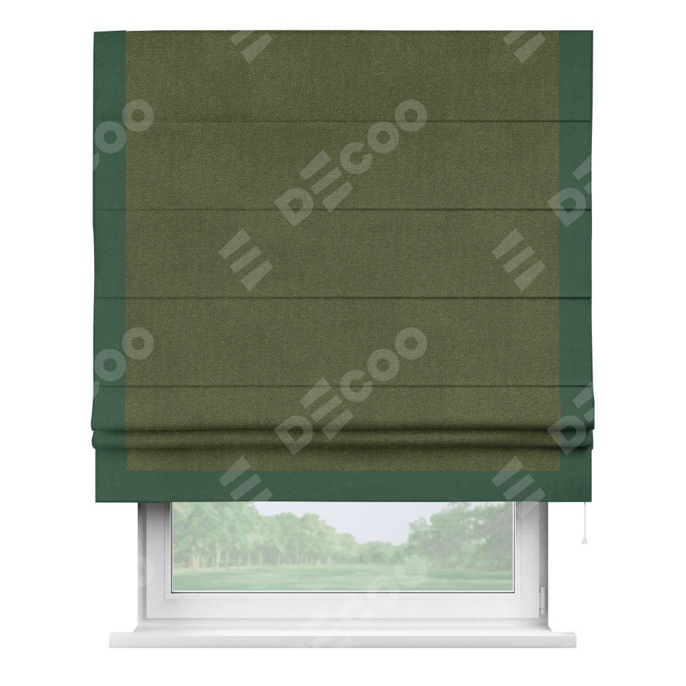 Римская штора производителя «Cortin», используется для проёма, пошита из ткани лён димаут салатовый, артикул 91002. Отделка шторы кантом «Виктория», ткань для канта используется из льна димаут разной расцветки на выбор. Имеет универсальный механизм и подходит для монтажа: на потолок, на стену и в нишу.