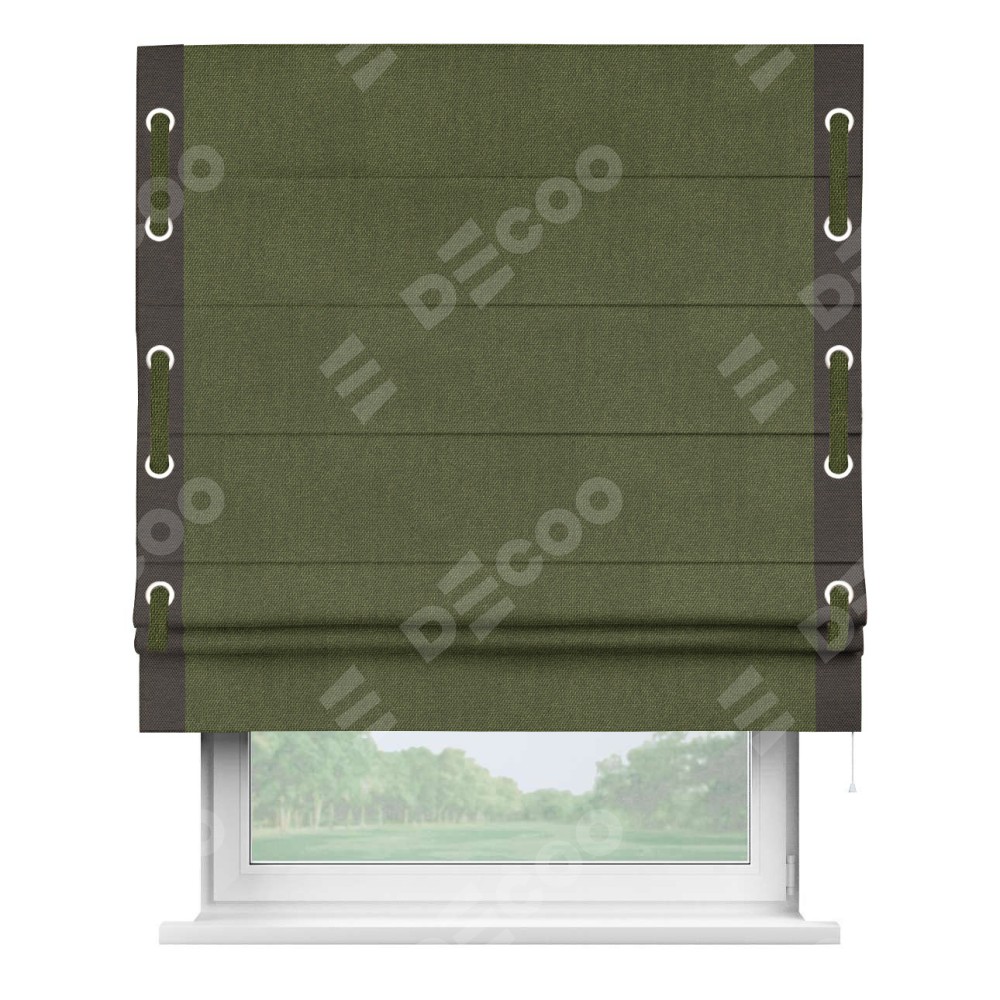 Римская штора «Кортин» для проема, лён димаут салатовый с кантом Стрим Дуо (люверсы с пояском)