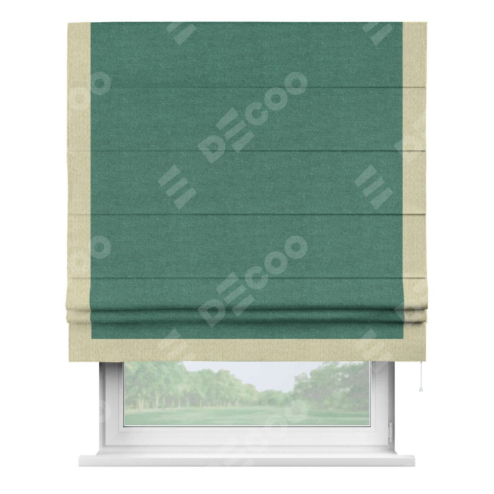 Римская штора производителя «Cortin», используется для проёма, пошита из ткани лён димаут светло-бирюзовый, артикул 91005. Отделка шторы кантом «Виктория», ткань для канта используется из льна димаут разной расцветки на выбор. Имеет универсальный механизм и подходит для монтажа: на потолок, на стену и в нишу.