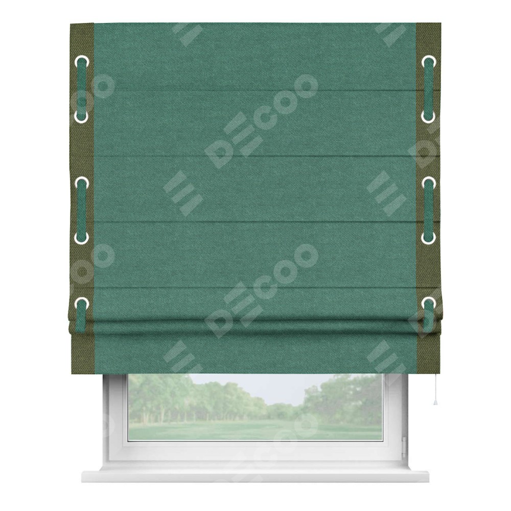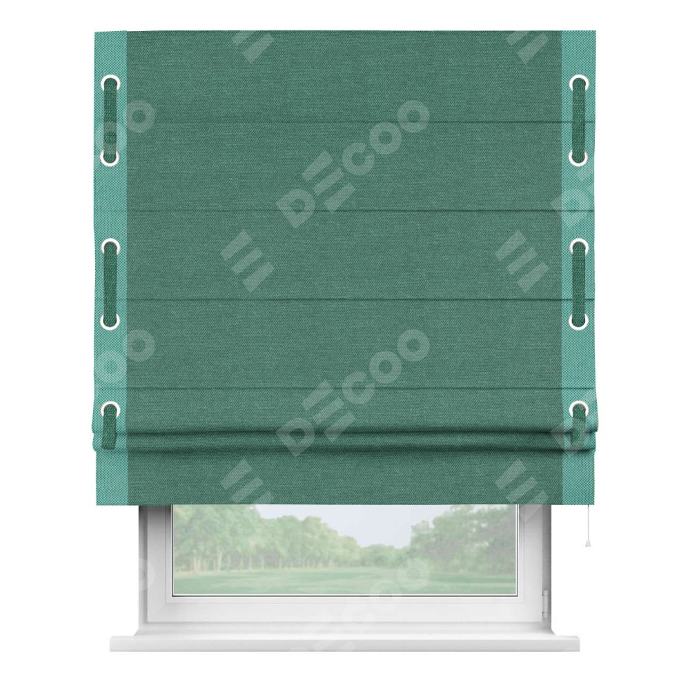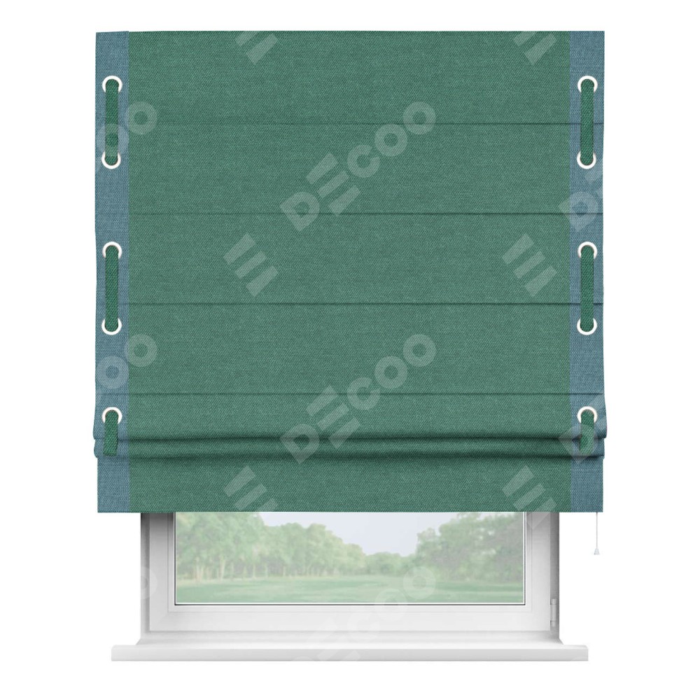 Римская штора «Кортин» для проема, лён димаут светло-бирюзовый с кантом Стрим Дуо (люверсы с пояском)