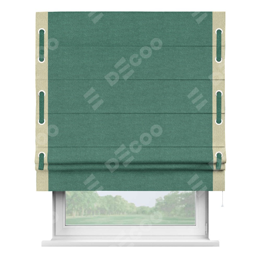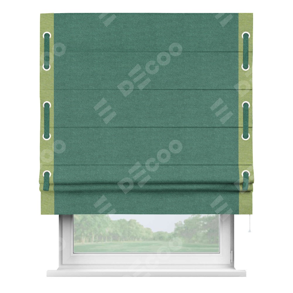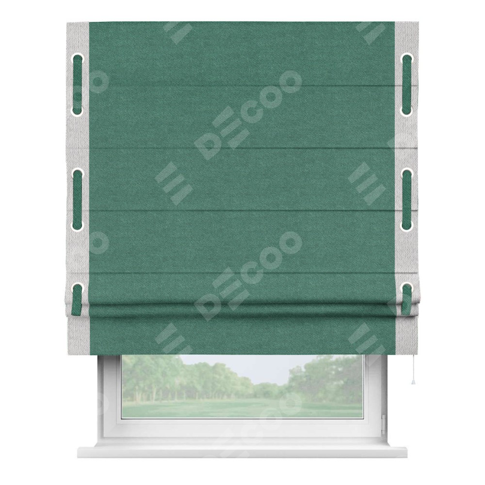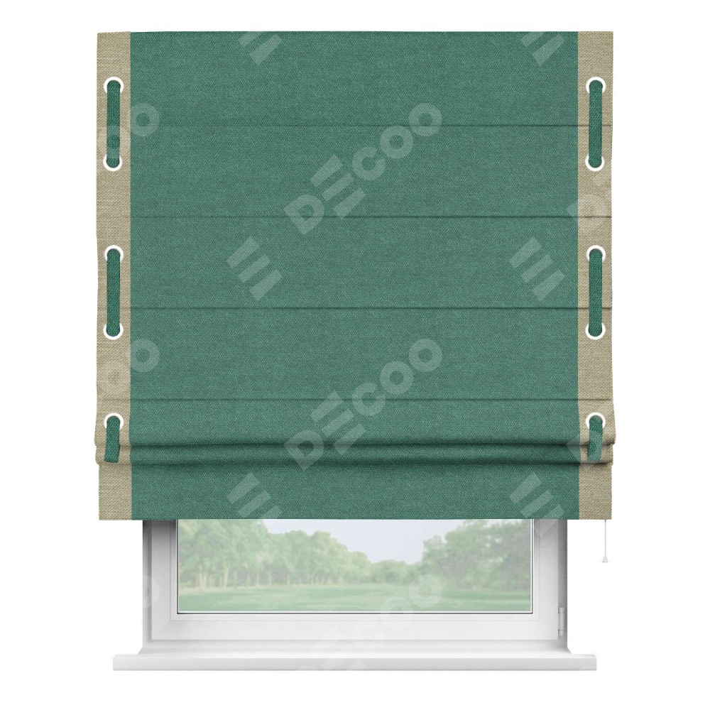 Римская штора «Кортин» для проема, лён димаут светло-бирюзовый с кантом Стрим Дуо (люверсы с пояском)
