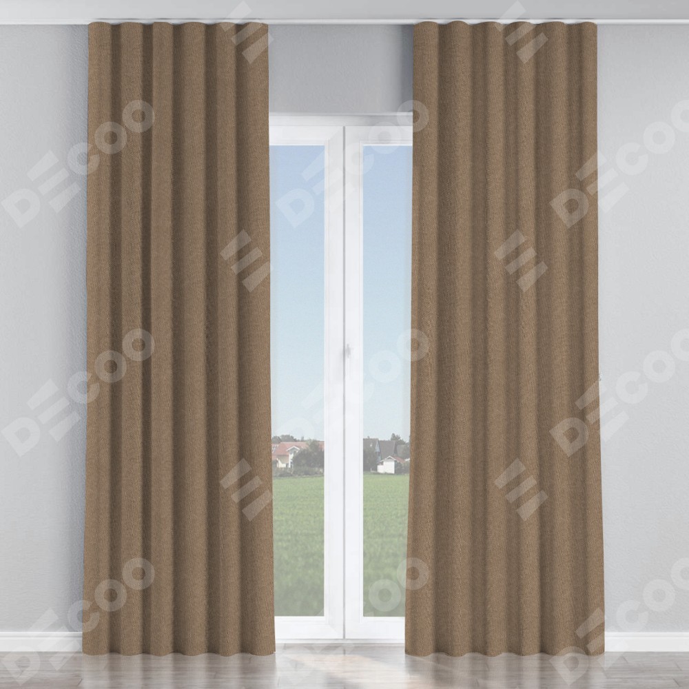 Комплект прямых штор, от производителя «Cortin», пошиты из ткани лён димаут коричневый, артикул ткани 90996. С изнаночной стороны в верхней части штор пристрачивается шторная лента с декоративными складками «Волна». Для создания элегантных складок прямые шторы шьются по стандарту с коэффициентом 1:2 (на 100 см. ширины проёма 200 см. ширины ткани).