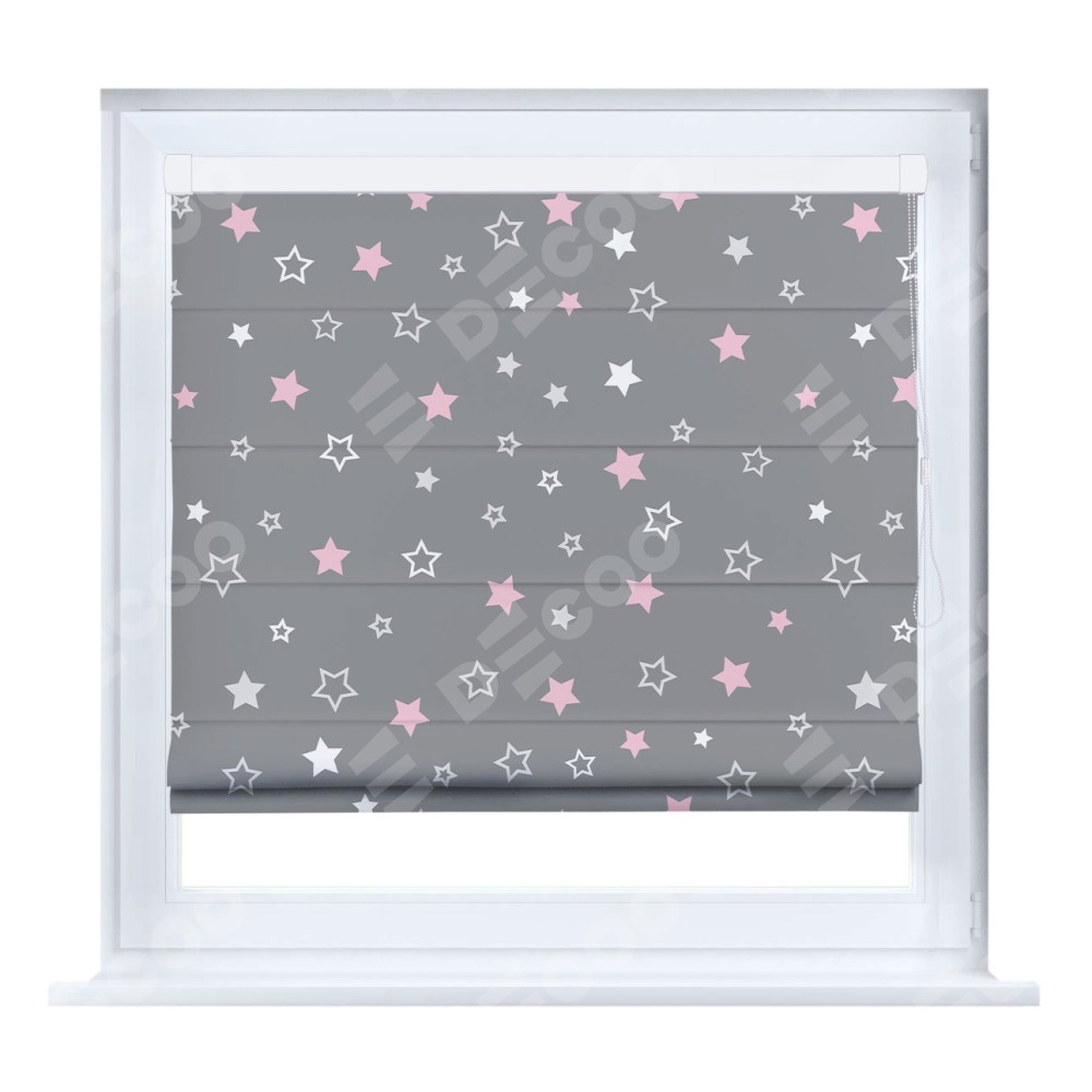 Римская штора производителя «Cortin», устанавливается на створку окна, пошита из ткани блэкаут с нанесением сублимационной печати «Розовый звездопад». Штора шьётся по индивидуальным размерам, для данного типа римской шторы возможная ширина от 35 до 150 см., высота до 250 см.