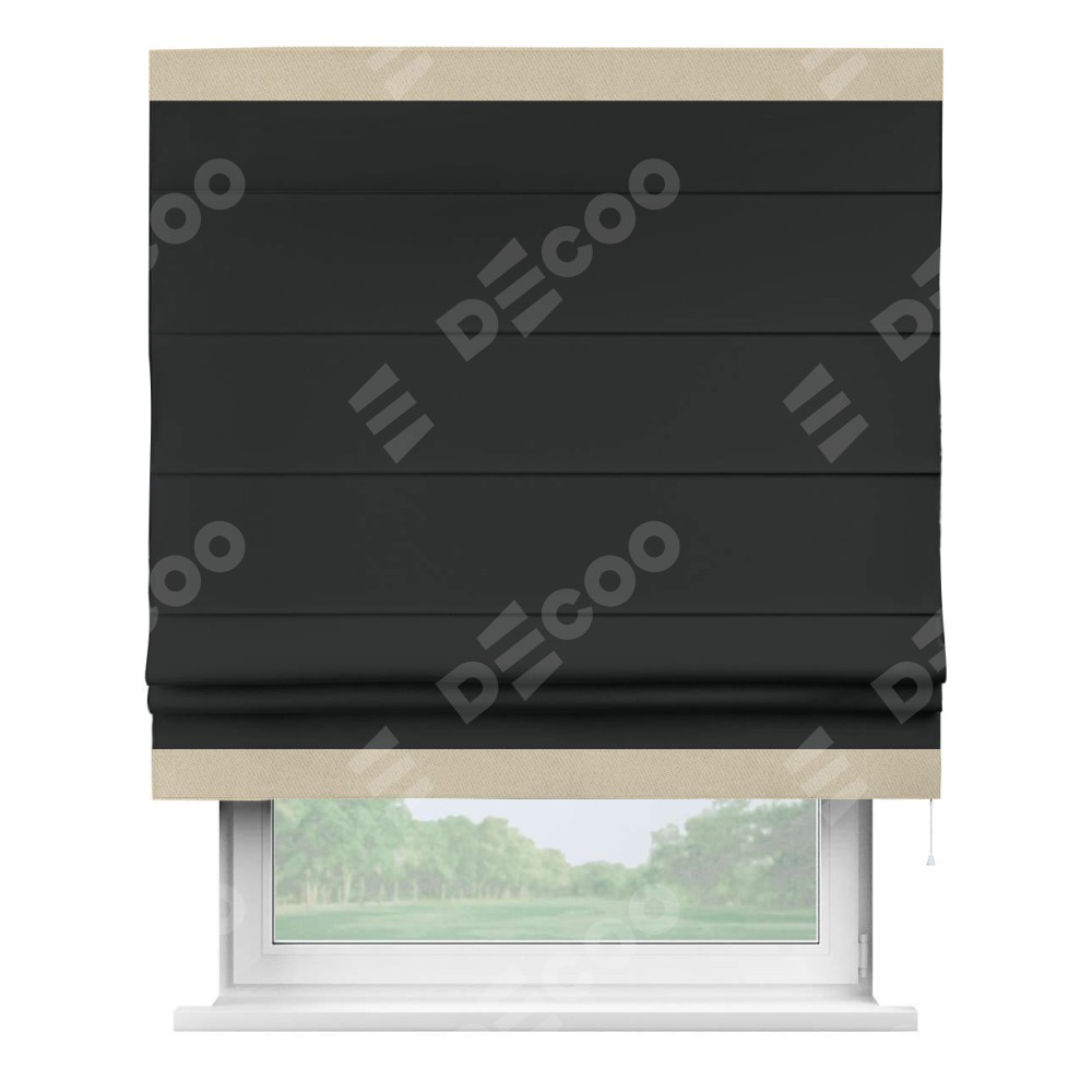 Римская штора производителя «Cortin», используется для проёма, пошита из ткани блэкаут однотонный черный, артикул ткани 91571−2. Отделка шторы кантом «Горизонт», ткань для канта используется из блэкаута однотонного разной расцветки на выбор. Имеет универсальный механизм и подходит для монтажа: на потолок, на стену и в нишу.