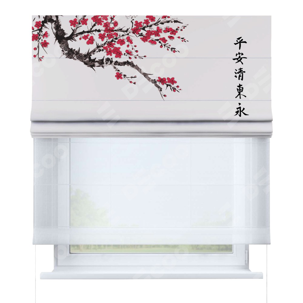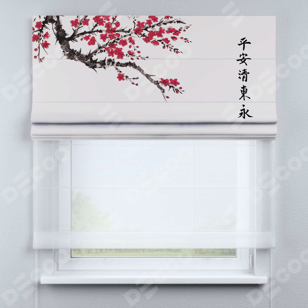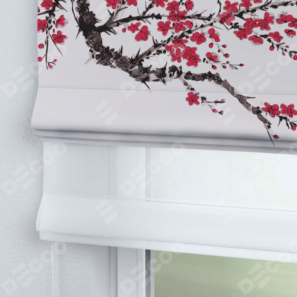 Двойная римская штора «День-ночь» от производителя Cortin предназначена для использования в проёмах. Эта штора уникальна тем, что состоит из двух полотен. На лицевой стороне находится блэкаут с нанесением сублимационной печати «Цветущая сакура», обеспечивающий эффективное затемнение. В комплект также входит вторая ткань — легкий белый тюль (артикул: V-01), который добавляет изящества и легкости оформлению окна. Кроме того, доступны и другие разновидности ткани тюль, выбор которых доступен по  ссылке .