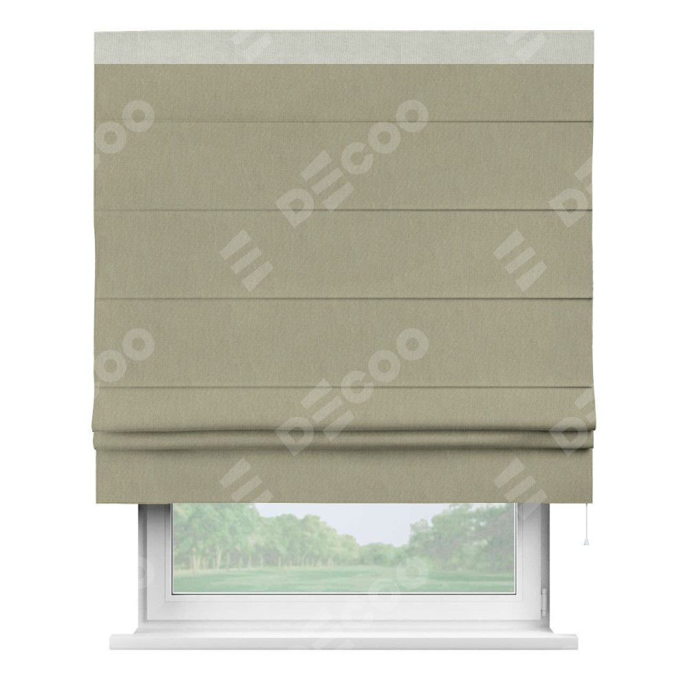 Римская штора производителя «Cortin», используется для проёма, пошита из ткани канвас латте, артикул ткани v-12490. Отделка шторы кантом «Кинг» (светло-серый v-371), ткань для канта используется из канваса разной расцветки на выбор. Имеет универсальный механизм и подходит для монтажа: на потолок, на стену и в нишу.
