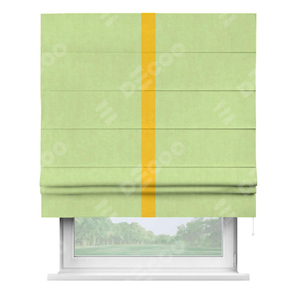 Римская штора производителя «Cortin», используется для проёма, пошита из ткани канвас липовый, артикул ткани v-207. Отделка шторы кантом «Хайвей» (желтый v-344), ткань для канта используется из канваса разной расцветки на выбор. Имеет универсальный механизм и подходит для монтажа: на потолок, на стену и в нишу.