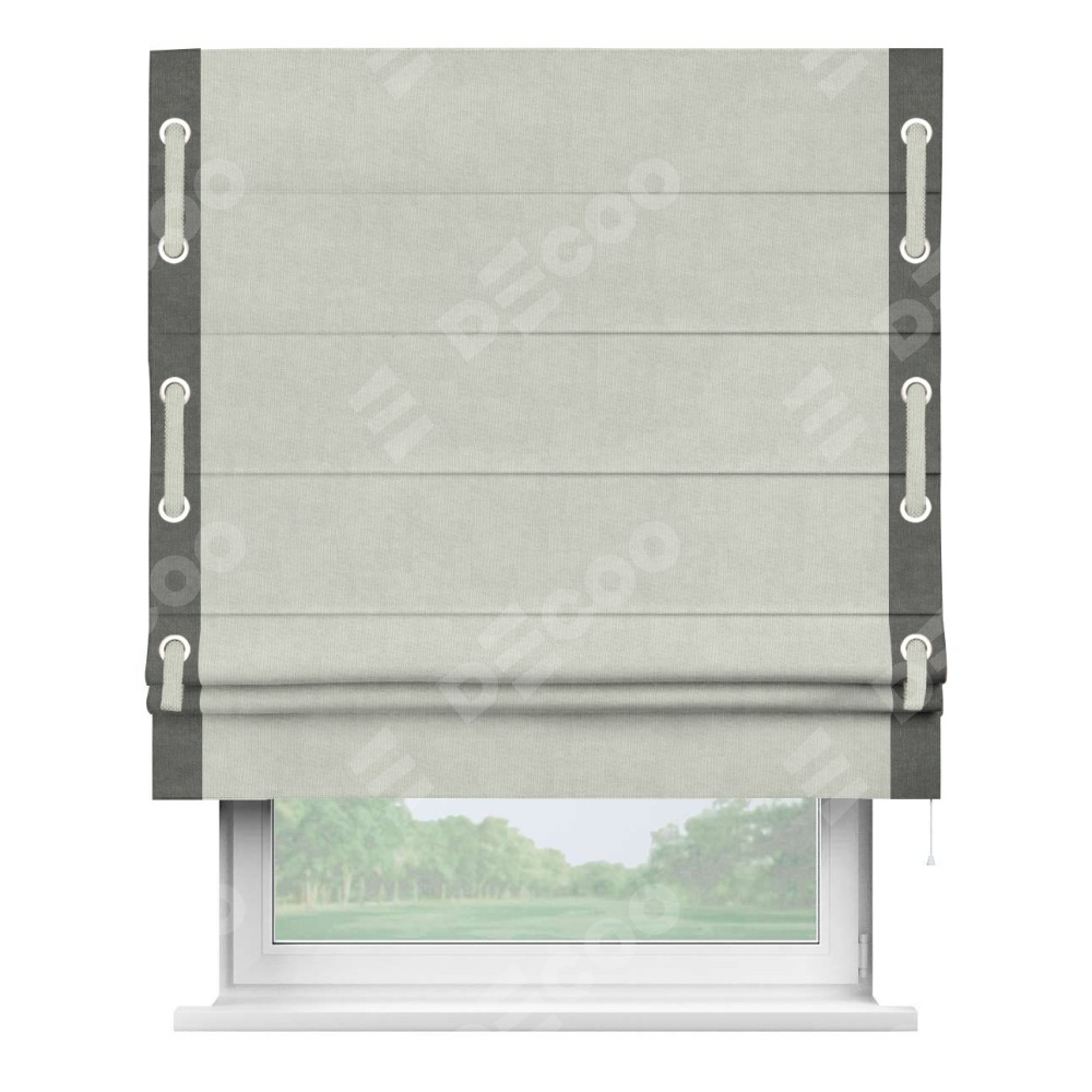 Римская штора производителя «Cortin», используется для проёма, пошита из ткани канвас светло-серый, артикул ткани v-371. Отделка шторы кантом «Стрим Дуо» (тёмно-серый v-340) на кантах расположены люверсы с пояском, ткань для канта используется из канваса разной расцветки на выбор. Ткань для пояска обычно используется из основной ткани шторы, а так же можно сделать из любой расцветки по желанию. Имеет универсальный механизм и подходит для монтажа: на потолок, на стену и в нишу.