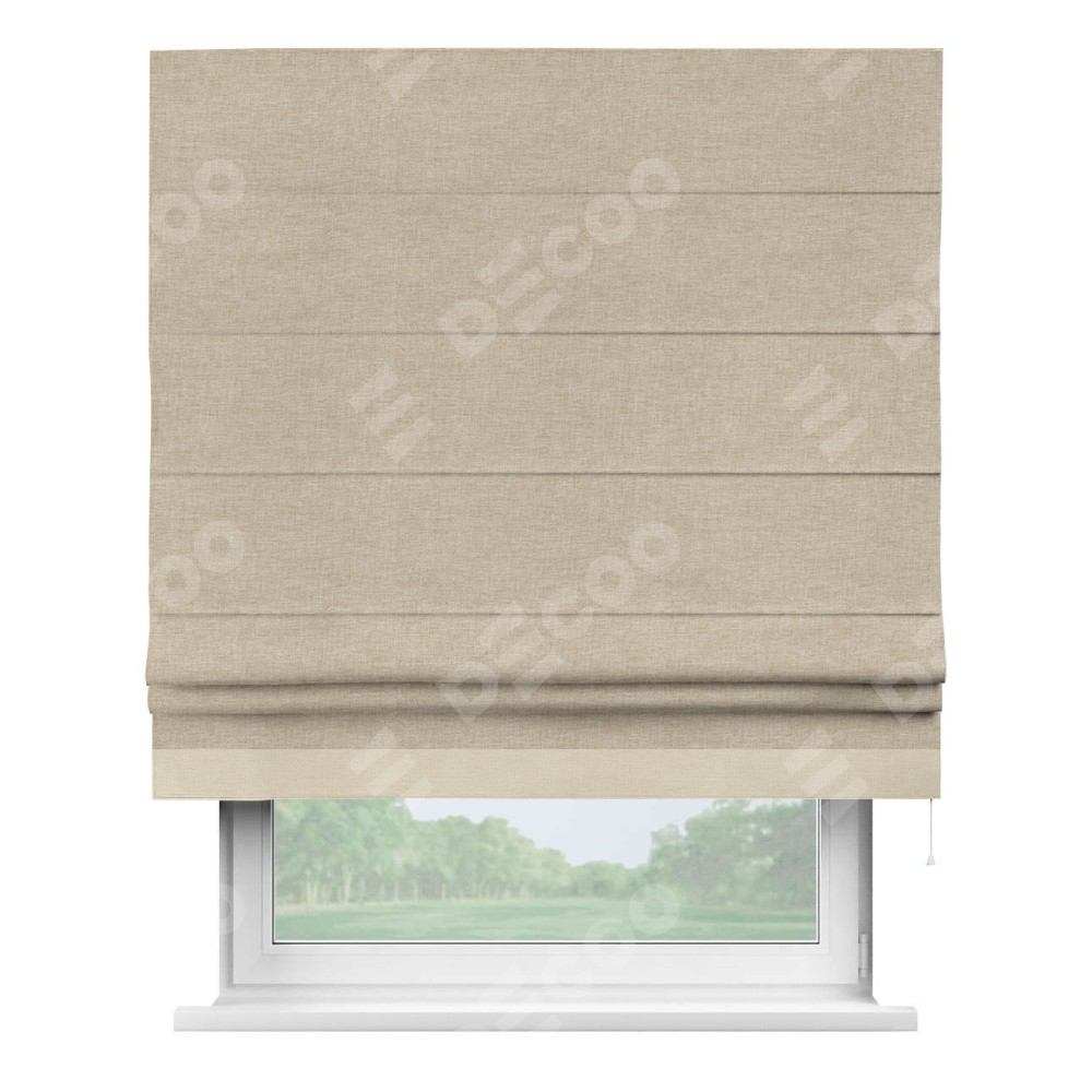 Римская штора производителя «Cortin», используется для проёма, пошита из ткани лён кашемир бежевый, артикул 17206. Отделка шторы кантом «Джестер», ткань для канта используется из льна разной расцветки на выбор. Имеет универсальный механизм и подходит для монтажа: на потолок, на стену и в нишу.