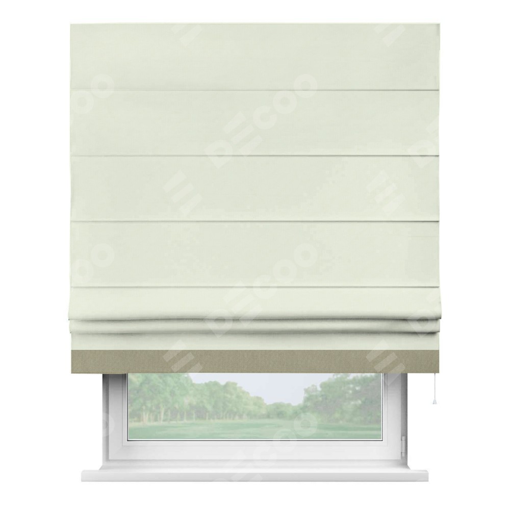 Римская штора производителя «Cortin», используется для проёма, пошита из ткани канвас сливочный, артикул ткани v-94. Отделка шторы кантом «Джестер» (латте v-12490), ткань для канта используется из канваса разной расцветки на выбор. Имеет универсальный механизм и подходит для монтажа: на потолок, на стену и в нишу.