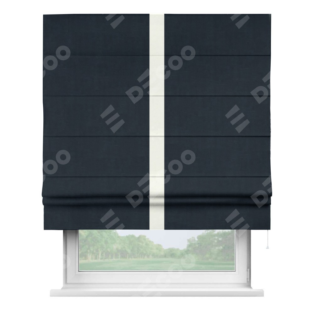 Римская штора производителя «Cortin», используется для проёма, пошита из ткани канвас тёмно-синий, артикул ткани v-206. Отделка шторы кантом «Хайвей» (молочный v-93), ткань для канта используется из канваса разной расцветки на выбор. Имеет универсальный механизм и подходит для монтажа: на потолок, на стену и в нишу.