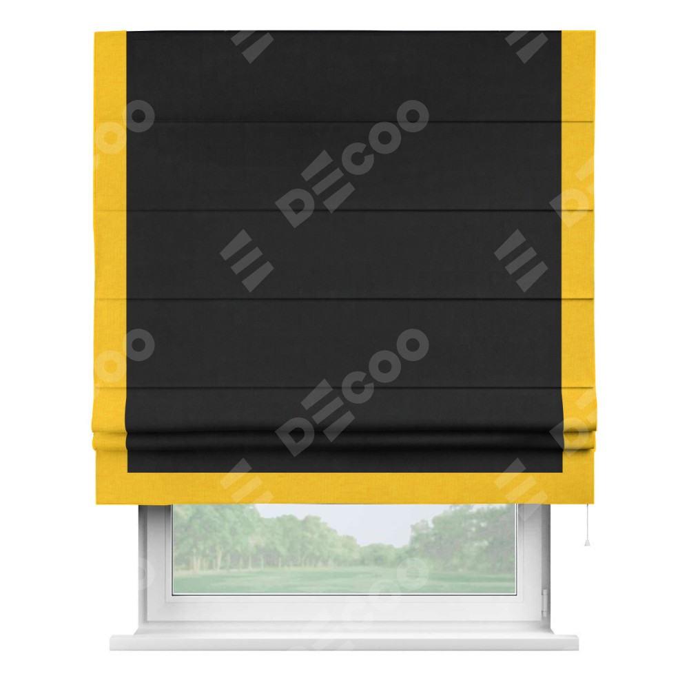 Римская штора производителя «Cortin», используется для проёма, пошита из ткани канвас черный, артикул ткани v-194. Отделка шторы кантом «Виктория» (желтый v-344), ткань для канта используется из канваса разной расцветки на выбор. Имеет универсальный механизм и подходит для монтажа: на потолок, на стену и в нишу.