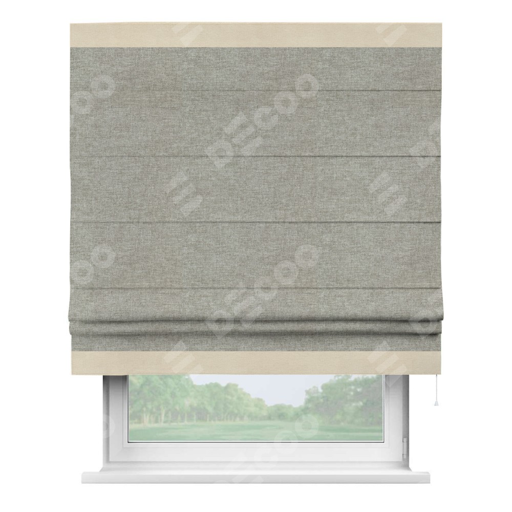 Римская штора производителя «Cortin», используется для проёма, пошита из ткани лён кашемир серый, артикул 17208. Отделка шторы кантом «Горизонт», ткань для канта используется из льна разной расцветки на выбор. Имеет универсальный механизм и подходит для монтажа: на потолок, на стену и в нишу.