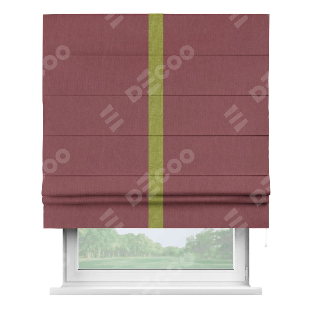 Римская штора производителя «Cortin», используется для проёма, пошита из ткани канвас ягодный, артикул ткани v-28. Отделка шторы кантом «Хайвей» (зелёное яблоко v-370), ткань для канта используется из канваса разной расцветки на выбор. Имеет универсальный механизм и подходит для монтажа: на потолок, на стену и в нишу.